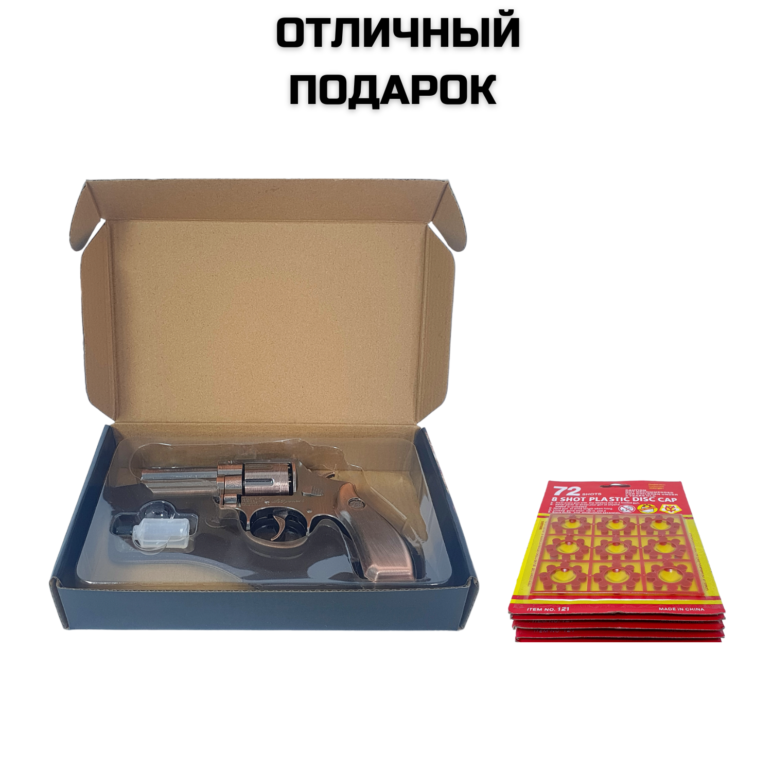 | Комплектация | Револьвер - 1 шт. Кобура - 1 шт. Пистоны - 360 шт. Масленка - 1 шт. Коробка - 1 шт. |