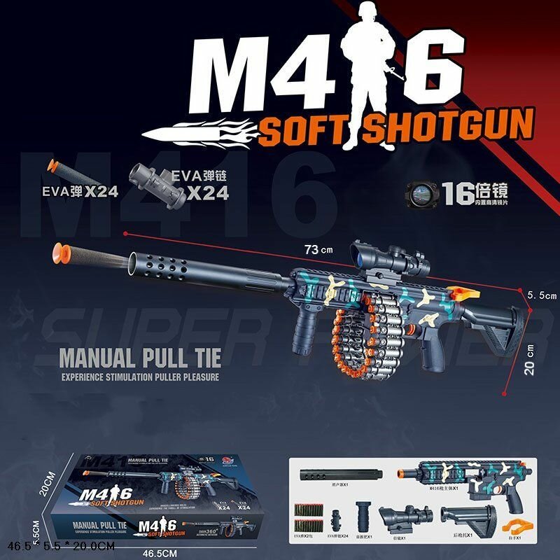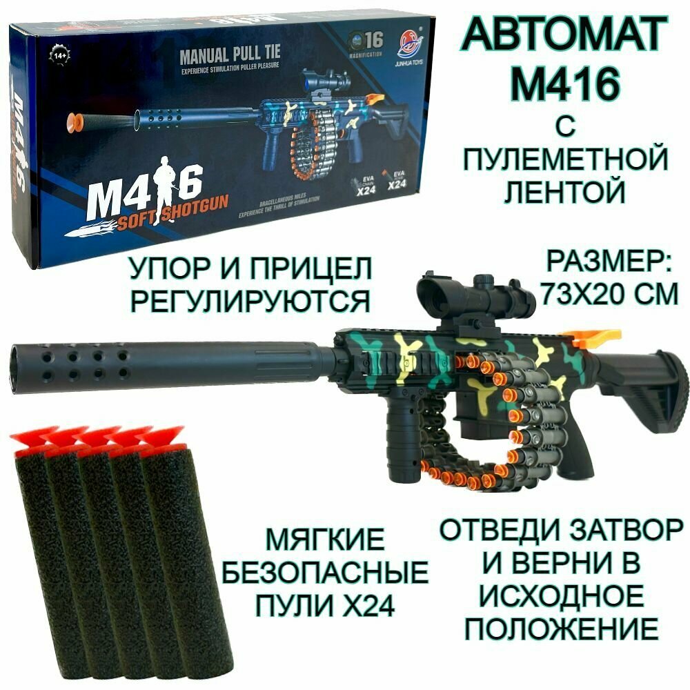 Купить Автомат М416 стреляет мягкими пулями, пулемет с глушителем, с пулеметной лентой, бластер с патронами, винтовка с прицелом, детское оружие, 73 см