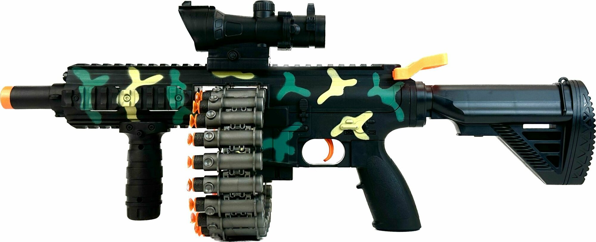 | Особенности | батарейки в комплекте / вылетающие гильзы / извлекаемая обойма / лазерное / помповое / с прицелом / с фонариком |