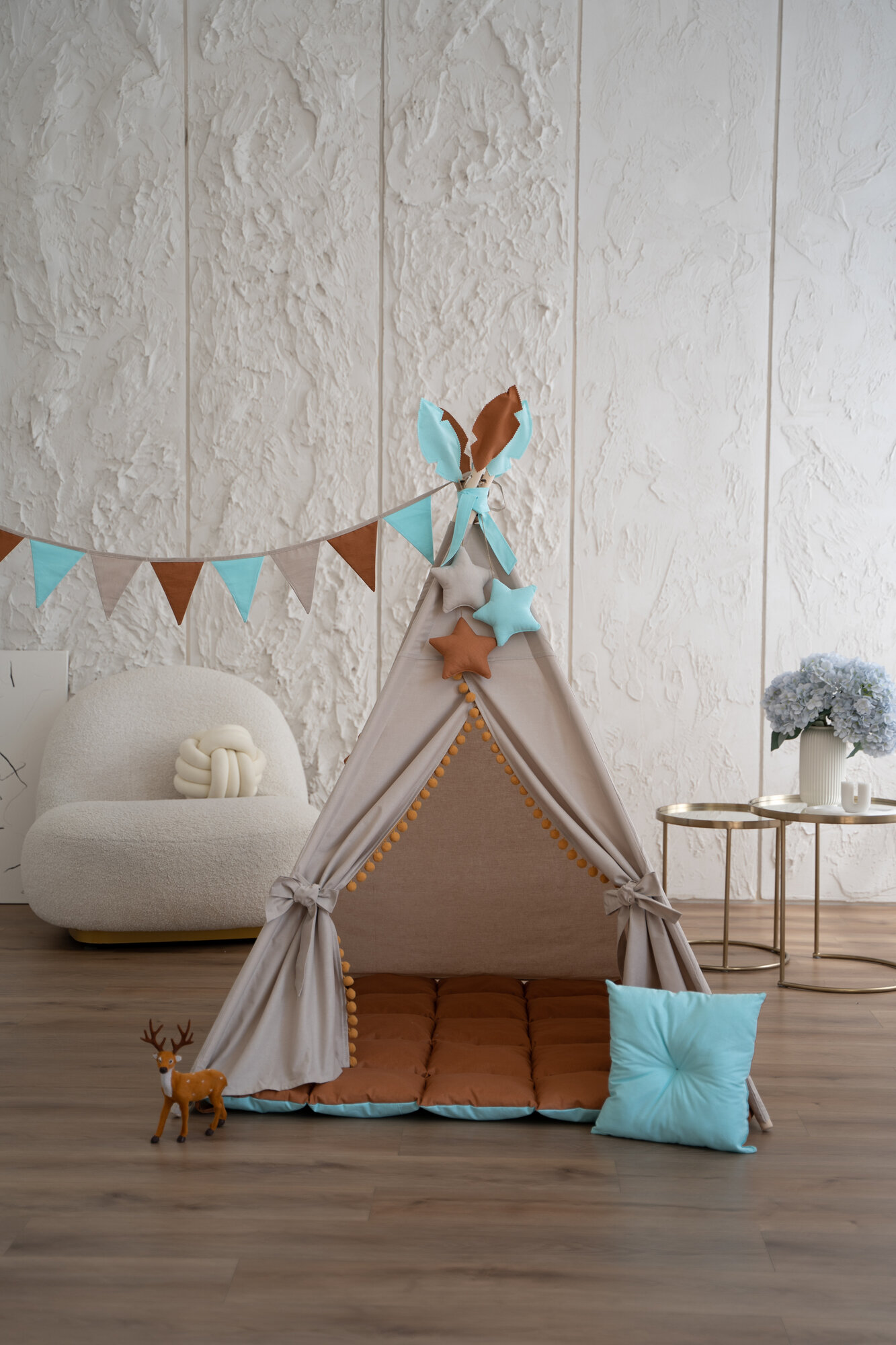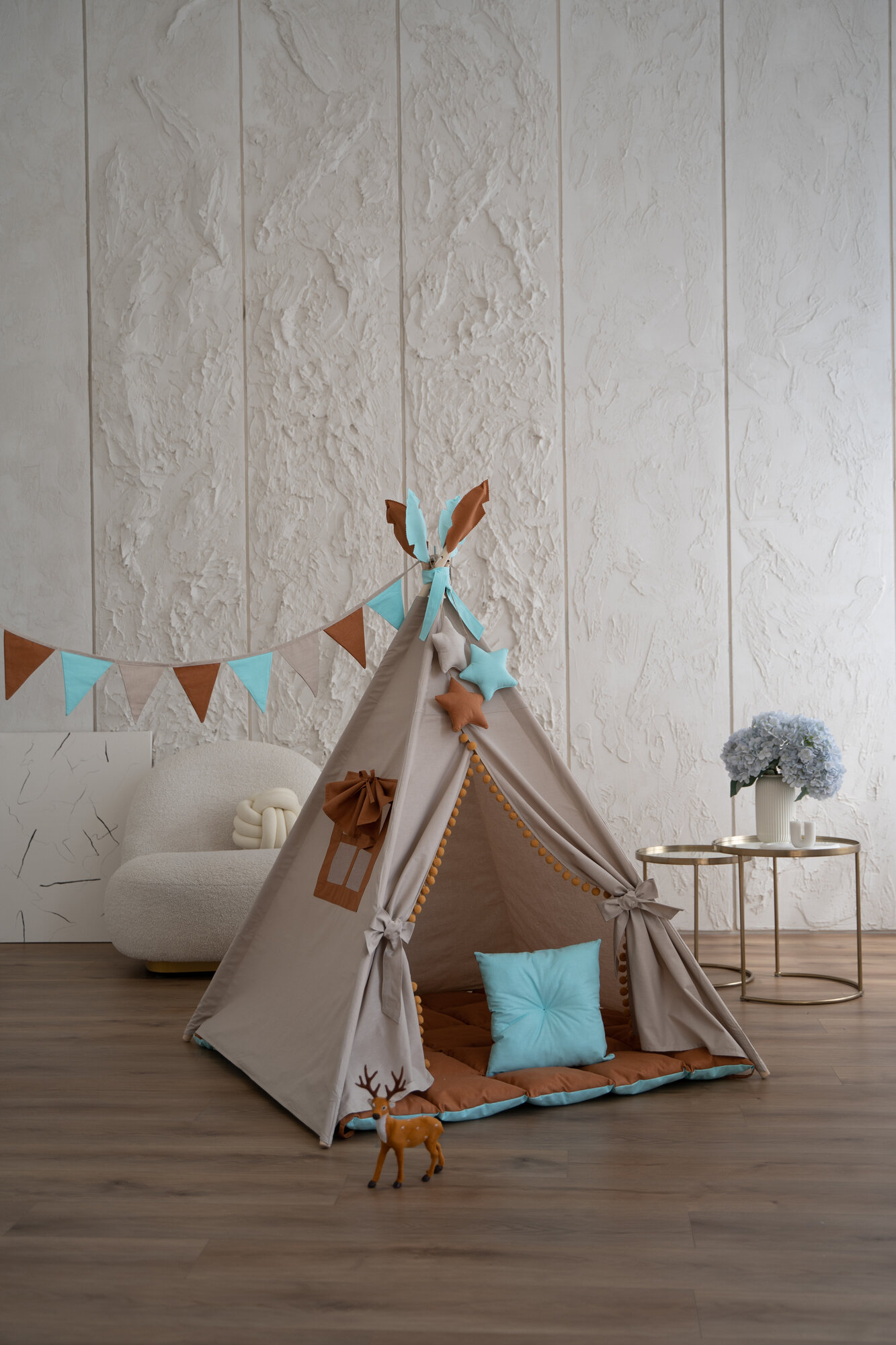 Вигвам детский с ковриком, окошком , подушкой и антискладывателем темно-серый/мятный