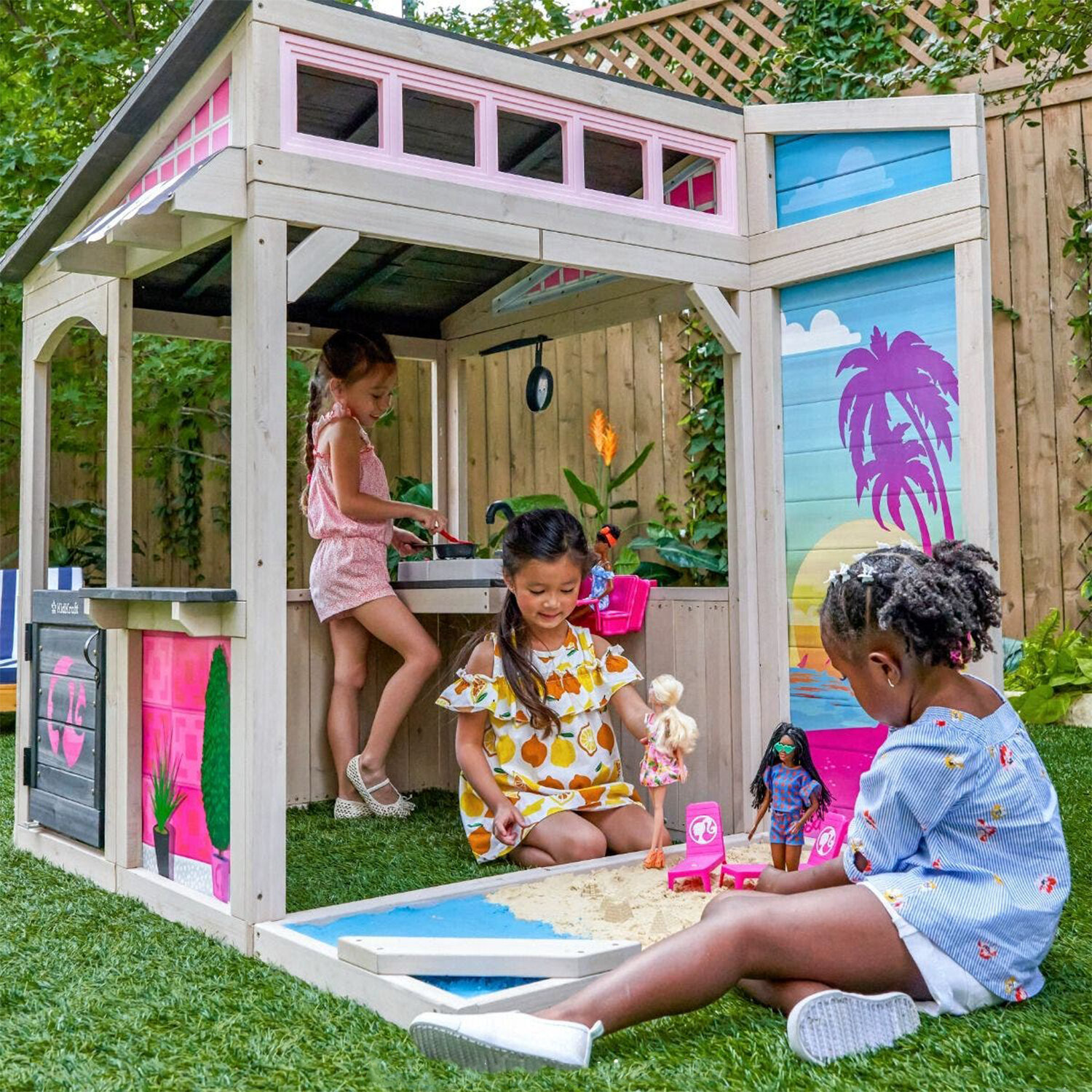 Открытый уличный игровой домик-веранда для детей, с кухней и песочницей интересное: