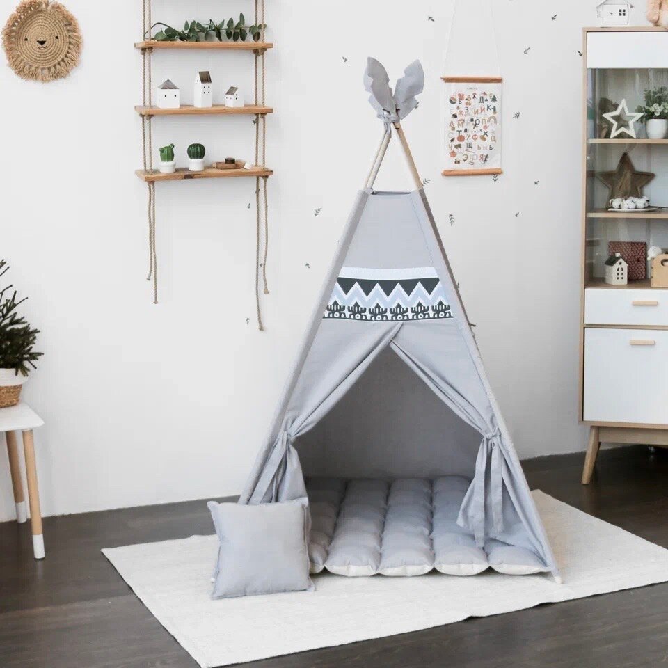 Купить Вигвам детский игровой домик серый льняной с ковриком