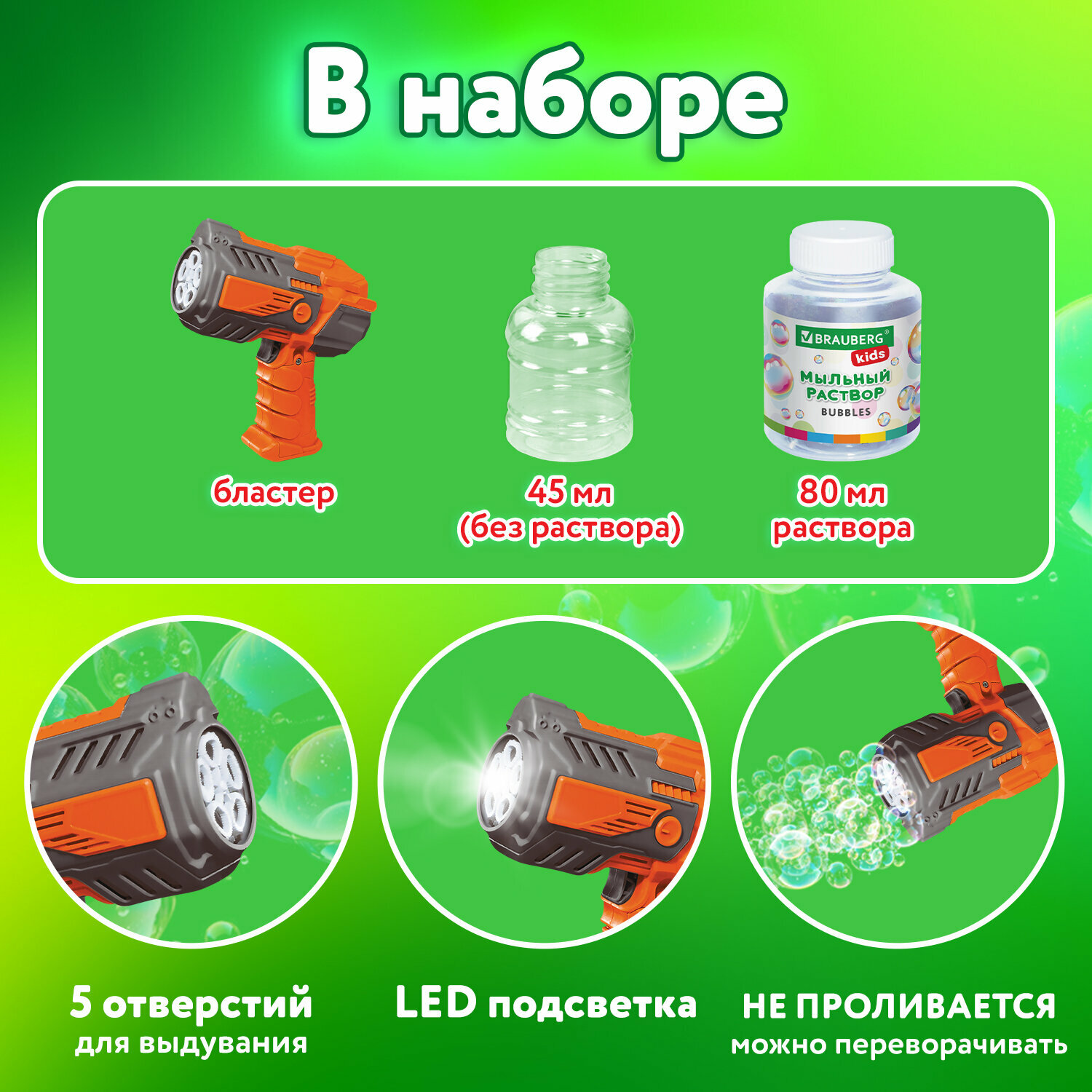 Генератор мыльных пузырей, пистолет детский с потайным баком, бластер, набор с раствором 80 мл, игрушки для мальчиков и девочек, Brauberg Kids, 665149