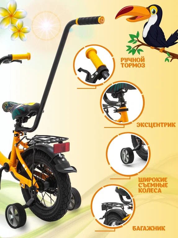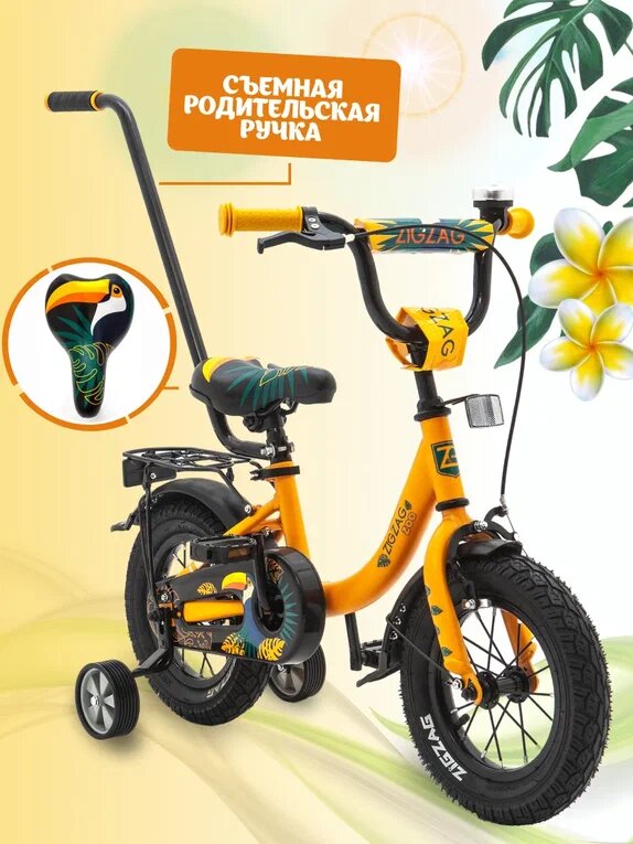 Велосипед детский двухколесный 12" ZIGZAG ZOO оранжевый с родительской ручкой для детей от 2 до 4 лет интересное: