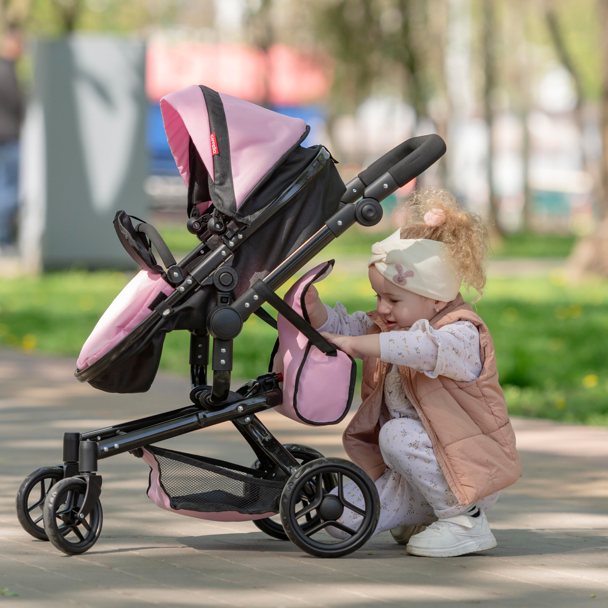 Коляска-трансформер для кукол Carrello Fortuna, складной капюшон, поворотные колеса, розовая с черной рамой