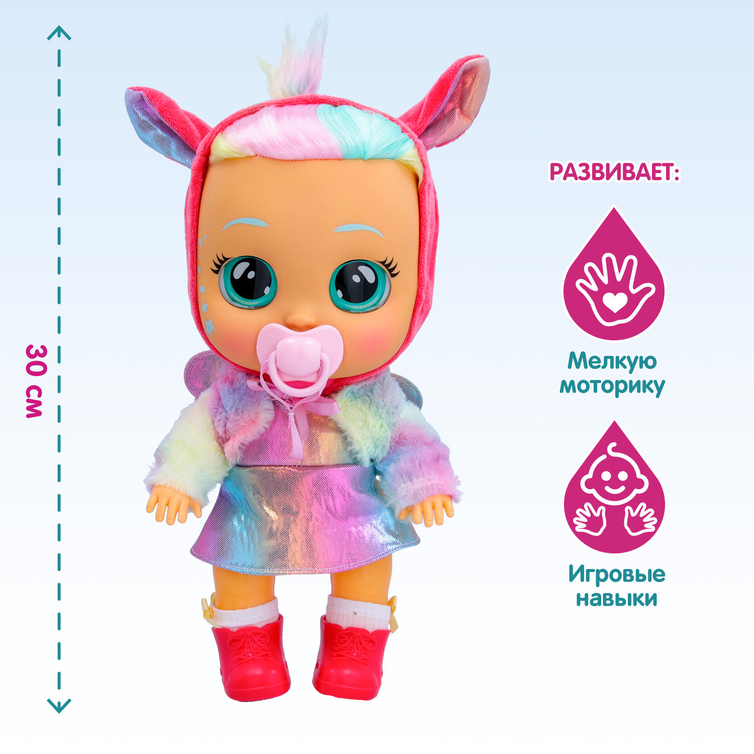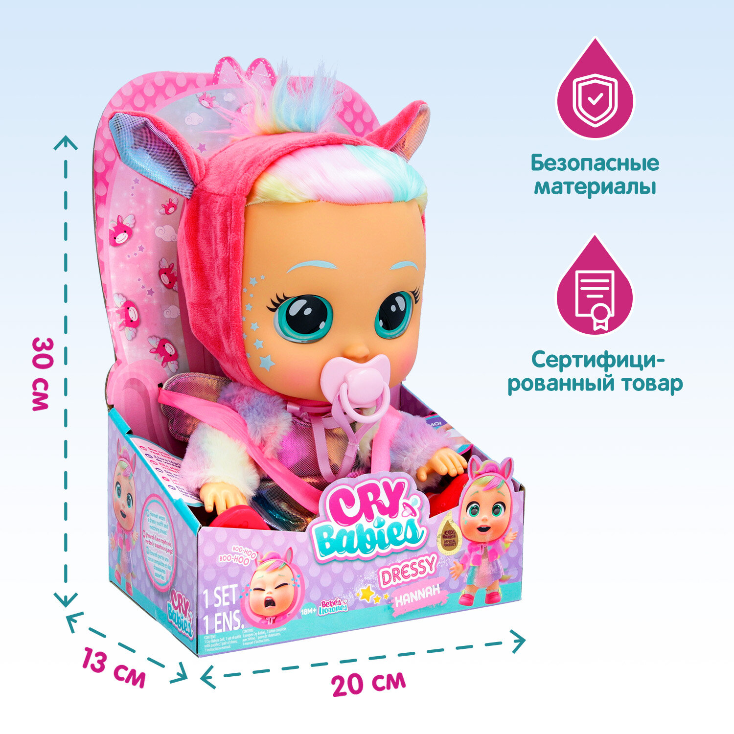 | Комплектация | кукла, съемная одежда, съемная обувь, пустышка, инструкция |