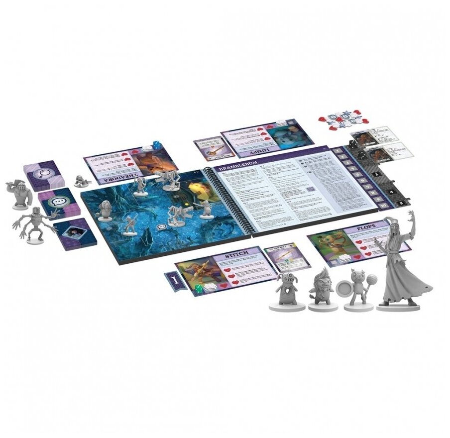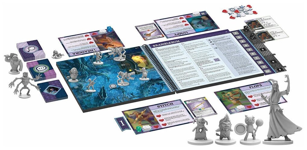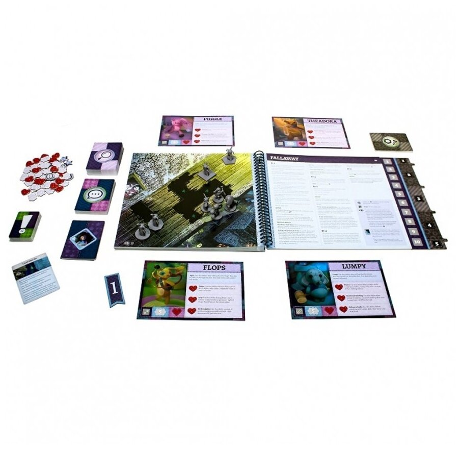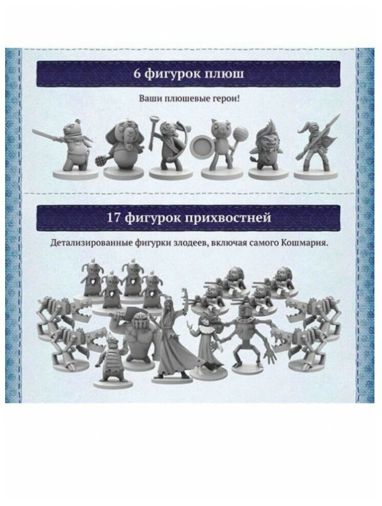 | Комплектация | Правила игры, книга сказок, 40 карт находок, планшет сказки, 6 фигурок плюш, 17 фигурок прихвостней, 35 кубиков, мешочек для кубиков, 15 пуговиц, 6 карт персонажей, 29 карт потеряшек, 10 карт сна, 47 карт предметов, 12 карт прихвостней, 7 карт местности, 34 карты состояний, 4 памятки, 32 жетона набивки, 16 жетонов сердец, 4 жетона целей, 4 жетона потеряшек, жетон закладки, жетон красного прицепа, жетон поезда, жетон двери. |
