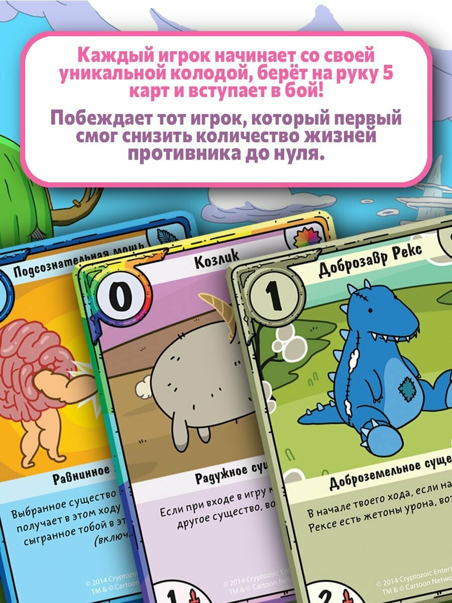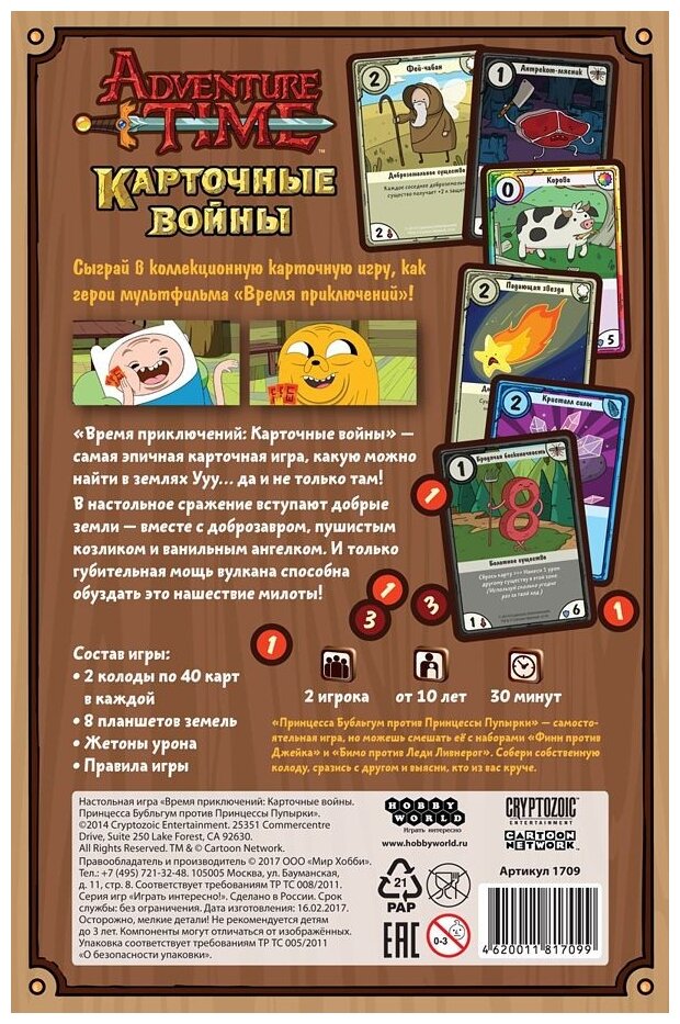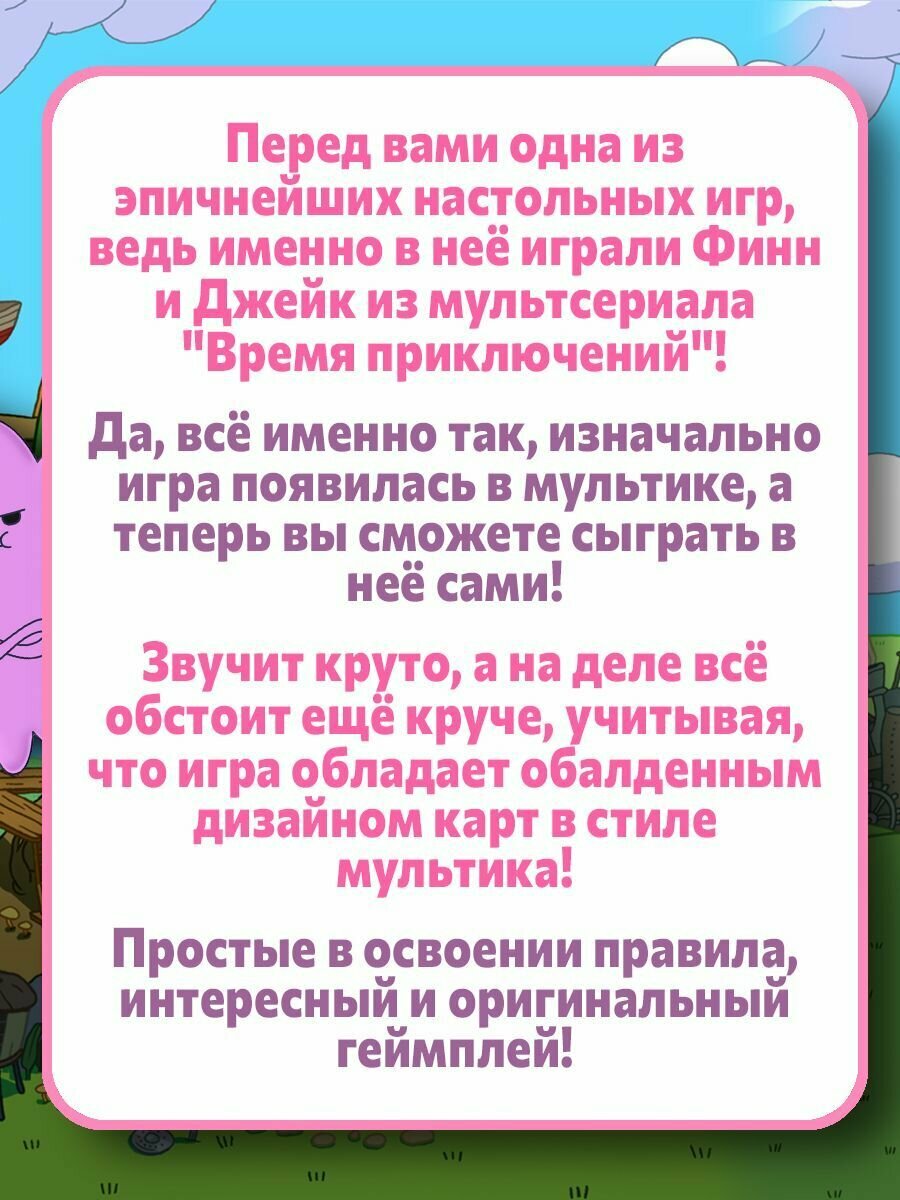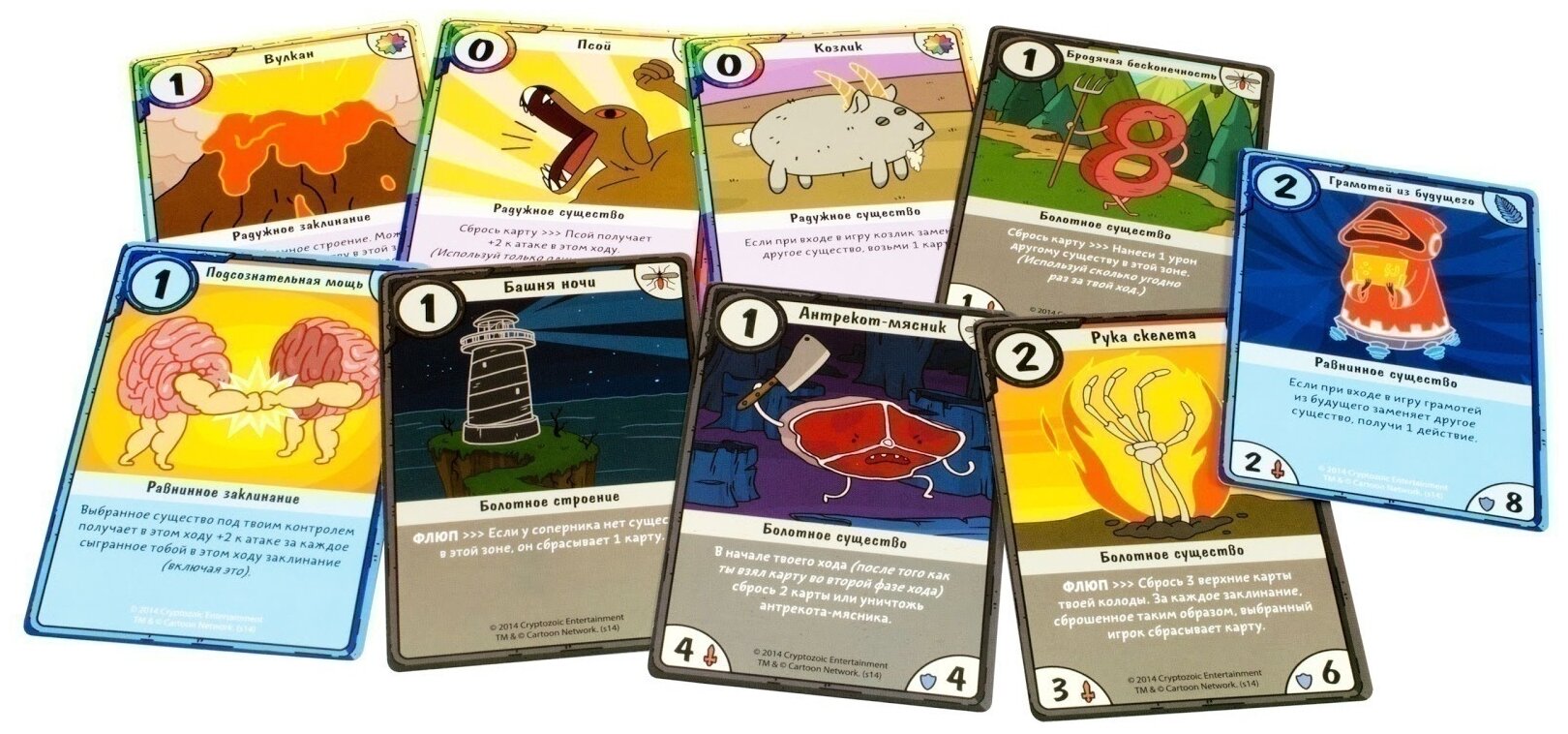 | Дополнительная информация | Игра по мотивам популярного мультипликационного сериала Adventure Time. Её можно смешать с набором «Финн против Джейка» и собрать свою уникальную колоду. |
