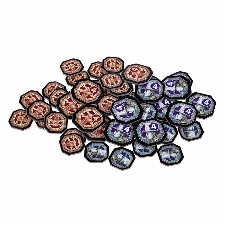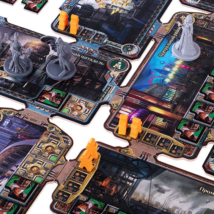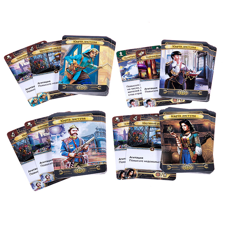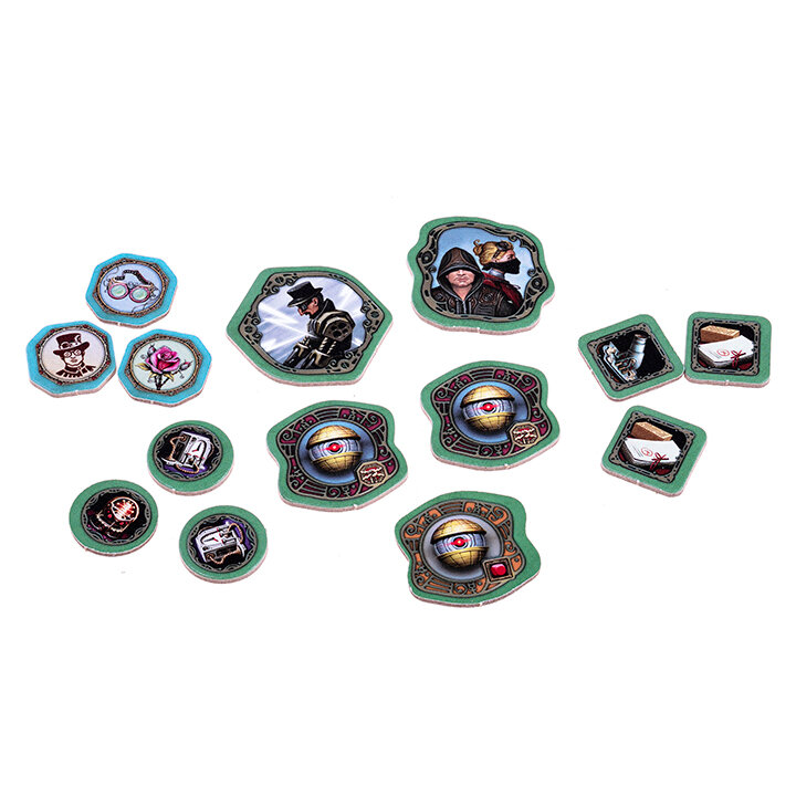 | Комплектация | 1 планшет развития, 10 тайлов районов, 30 жетонов влиятельных жителей, 45 жетонов трастов и бондов, 40 карт городских событий, 1 маркер развития, 9 жетонов районов, 6 фигурок героев, 6 карт героев, 64 карты доступа, 1 кубик атаки, 1 кубик побега, 3 жетона мятежей, 15 карт миссий, 14 жетонов миссий, 11 памяток, 3 фигурки слуг, 3 жетона слуг, 18 фишек стражей, 3 жетона облав, 18 карт директив, 9 фишек усиления, 13 карт движения слуг, 3 карты действий слуг, 4 карты специальных событий, 1 запечатанный конверт, правила игры, приложение. |