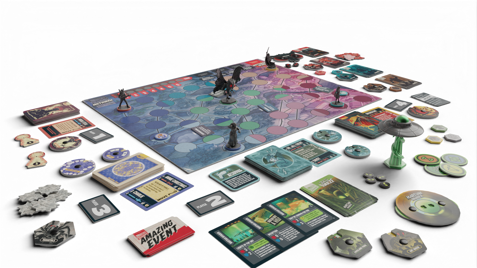 | Комплектация | 95 карт с иллюстрациями от Мэтта Тейлора; Поле боя с рисунком Яна О'Тула; 3 предварительно зачищенные миниатюры Призрачного Гонщика, Люка Кейджа и Лунного Рыцаря; 1 пластиковый жетон помощника; 4 специальных счетчиков жизней; 5 жетонов Адского Пламени; 3 жетона схем; 3 жетона боя |