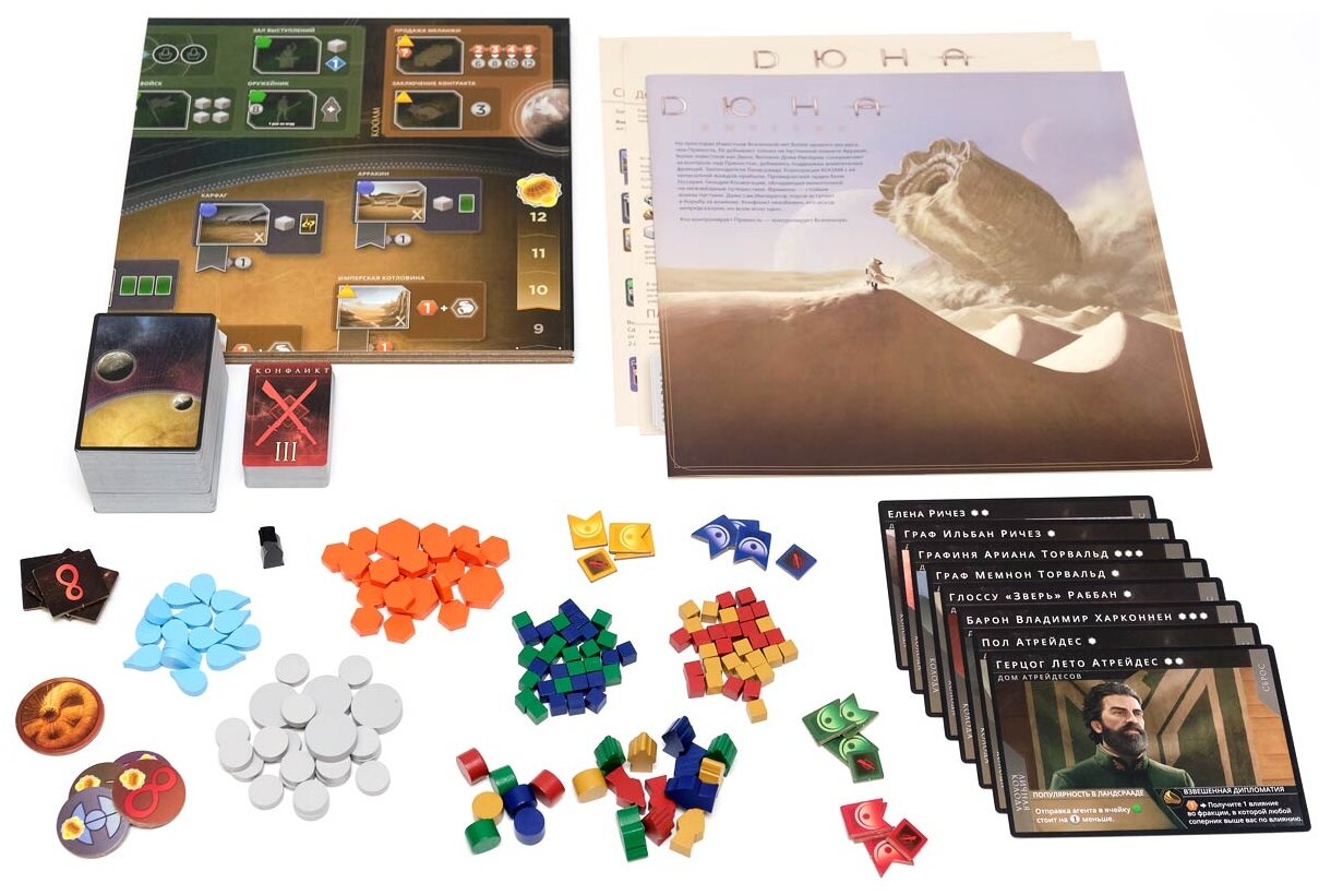 | Комплектация | игровое поле, справочник ячеек на игровом поле, 15 фишек воды, 24 фишки соляриев, 23 фишки пряности, фишка ментата, 18 карт конфликта, 24 карты резерва, 40 карт интриг, 67 карт империи, 8 планшетов лидеров, жетон первого игрока, 4 жетона союзов, 4 жетона барона харконнена, 31 карта дома хагаль, правила игры с домом хагаль |