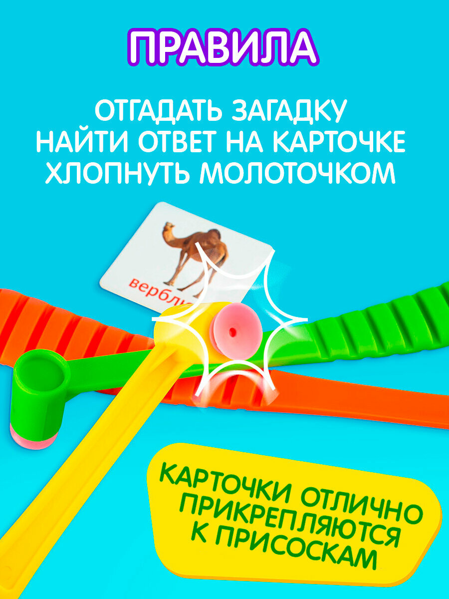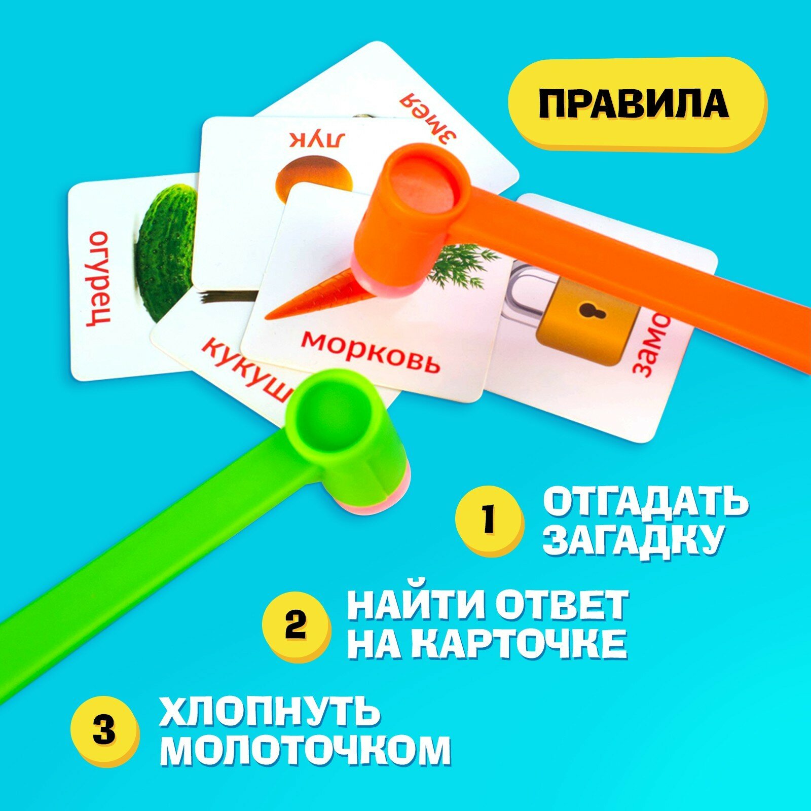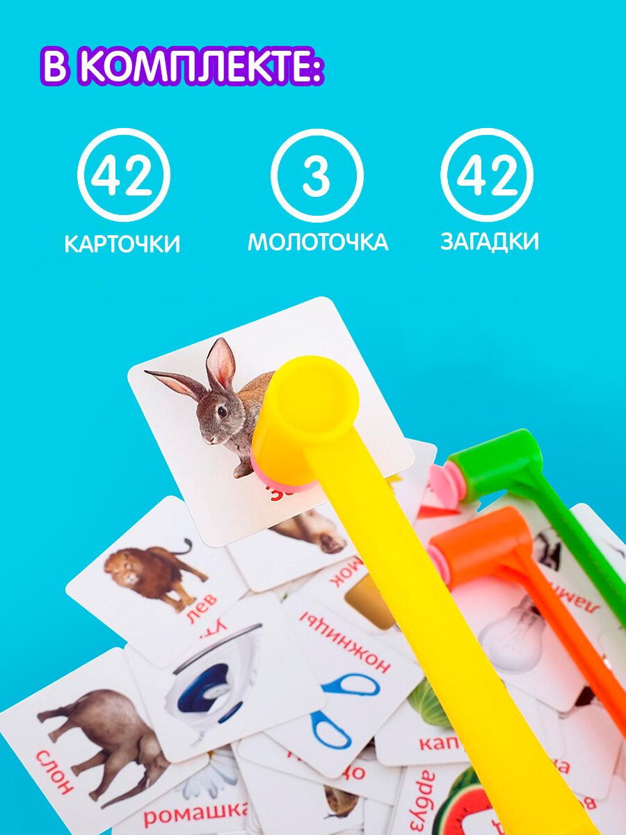 | Комплектация | 42 игровые карточки; лист с загадками (животные, предметы, овощи); 3 молоточка. |