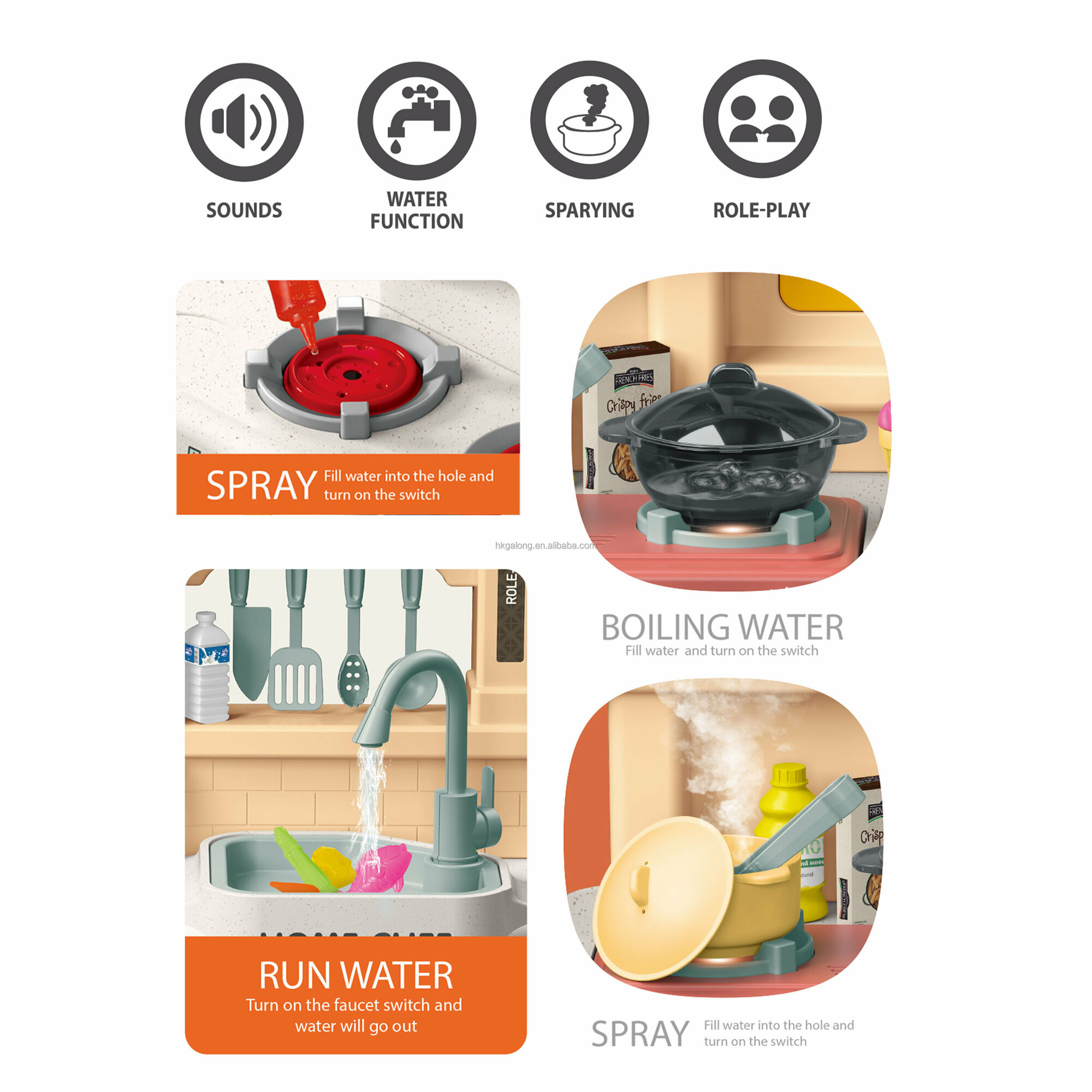 Детская игровая кухня с двумя духовками и буфетом с паром, водой, звуками, 73 аксессуара (922-136) интересное: