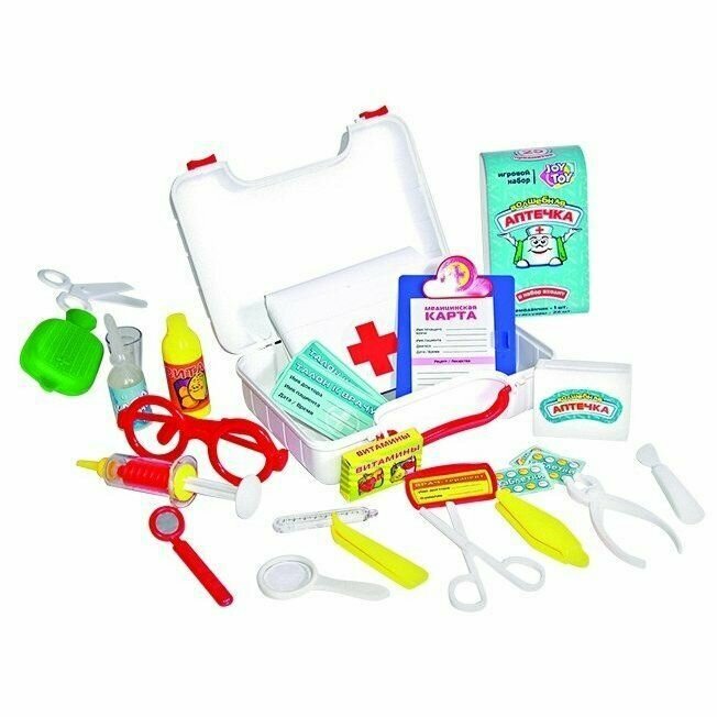 | Комплектация | чемоданчик, шапочка, коробочка с надписью "Волшебная аптечка", бейджик, фонендоскоп, 2 ножниц, 2 пинцета, шприц, лупа, мензурка, 2 бутылочки (капли для носа и витамины), коробочка с надписью "Витамины", градусник, грелочка, очки, 3 упаковки с надписью "Таблетки", планшет, 2 талона, щипцы |