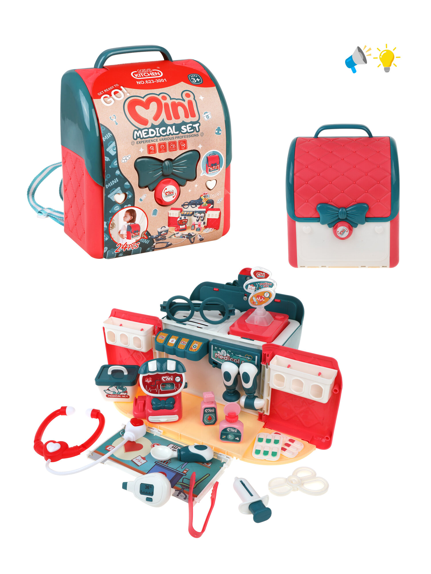 | Комплектация | фонендоскоп, ножницы, шприц, ложечка, пробирка, 2 баночки, монитор, весы, бейджик, шапочка доктора |