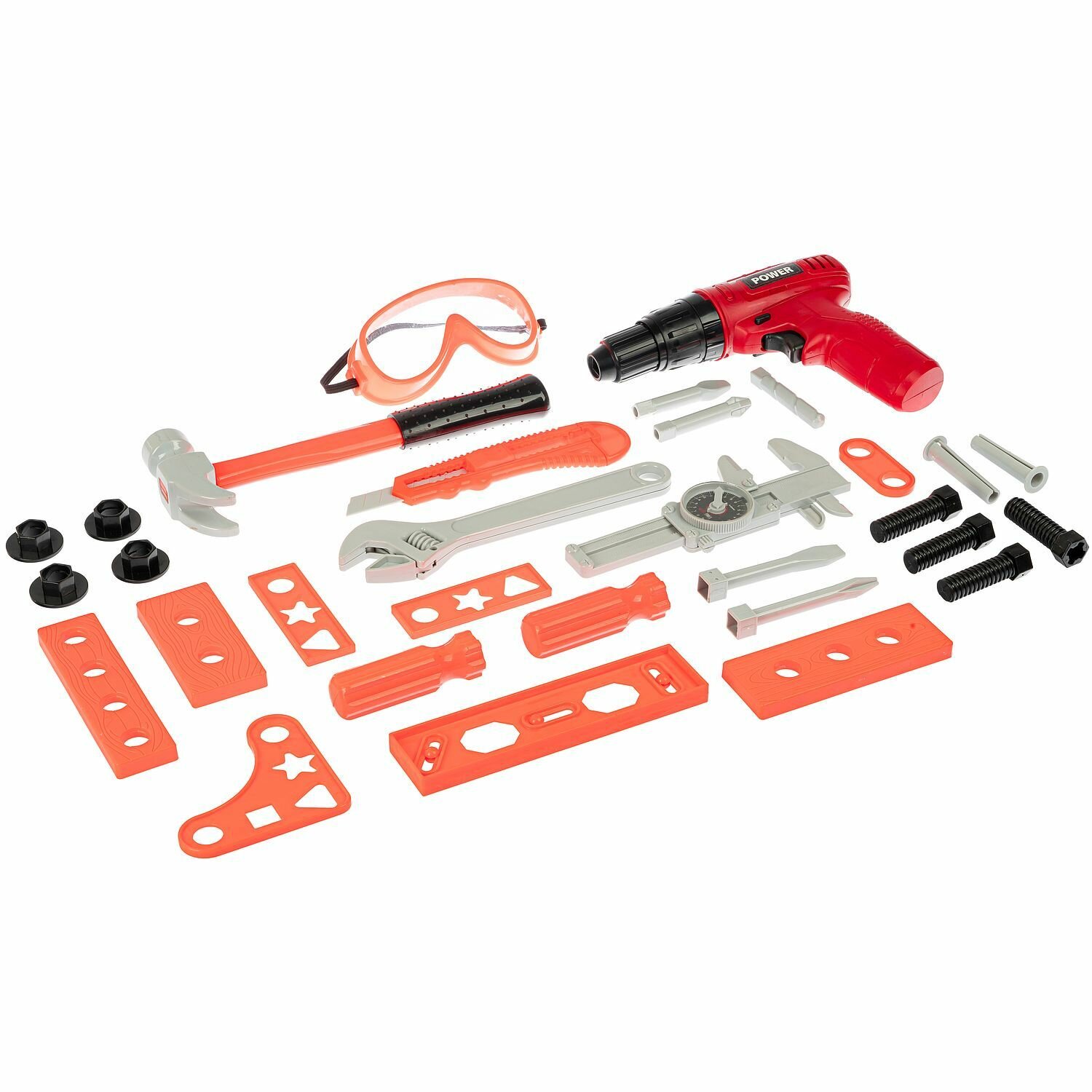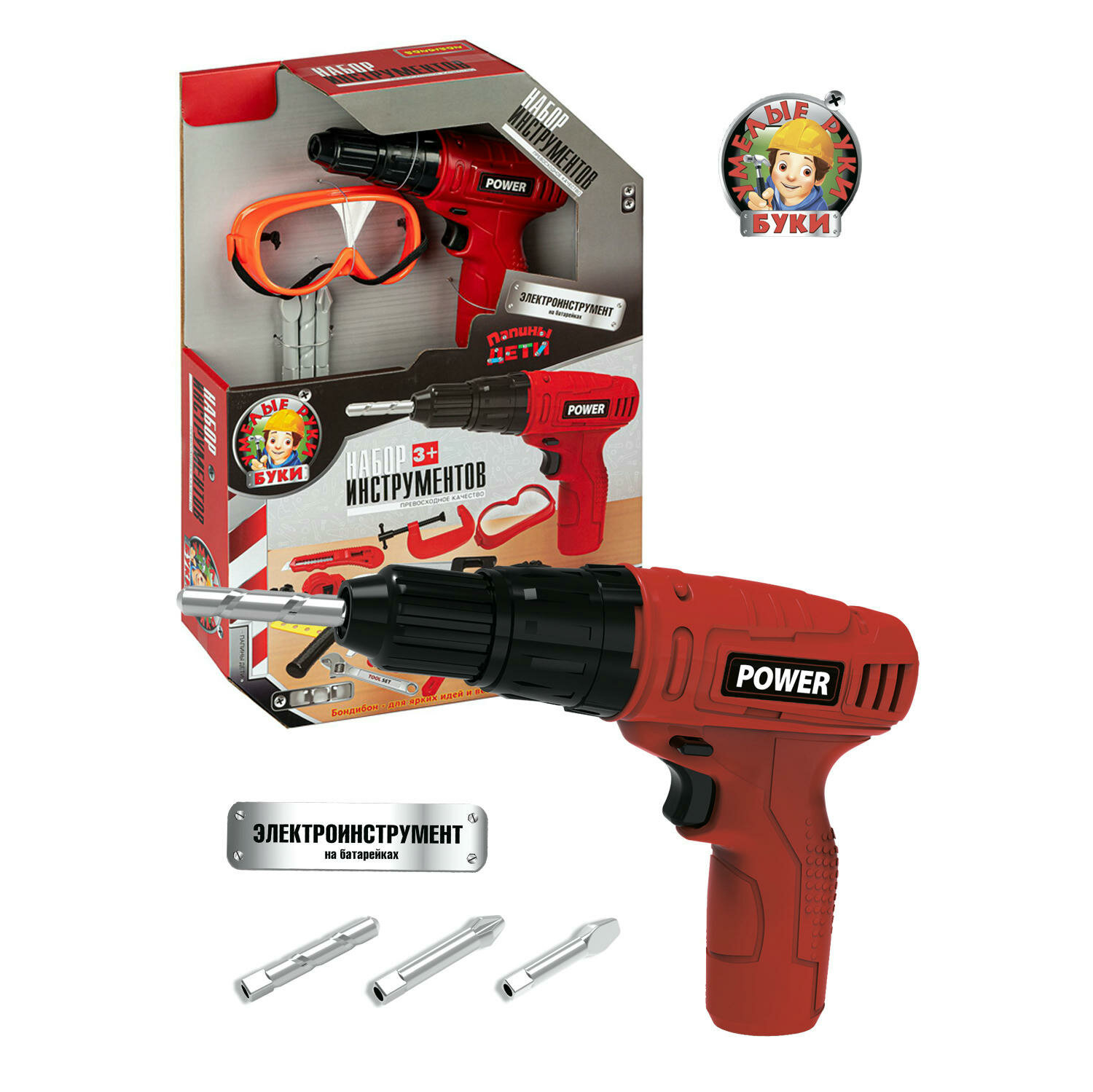 | Комплектация | дрель-шуруповерт с насадками на батарейках, маска, разводной ключ, отвертка со сменными головками, молоток, штангенциркуль, строительный нож, болты с гайками, трафареты и аксессуары для игры с набором инструментов |