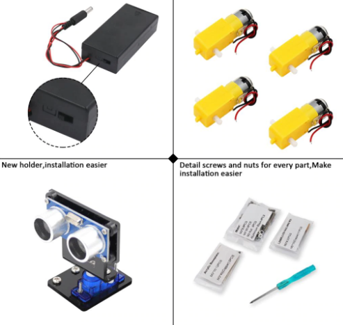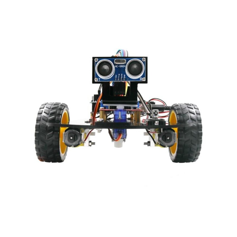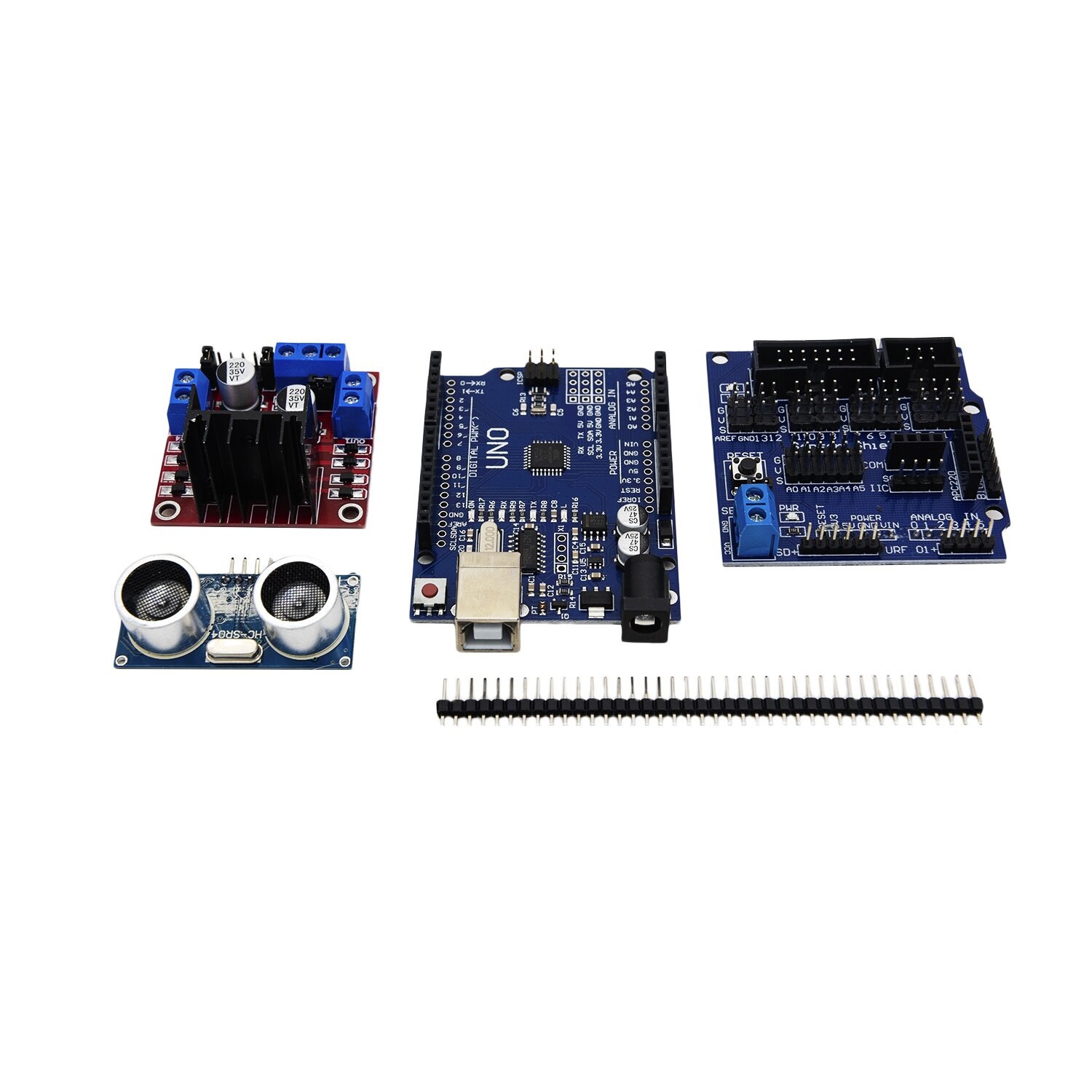 | Комплектация | акриловая основа, USB кабель, V5.0 плата расширения, драйвер двигателя L298N, ультразвуковой датчик HC-SR04, держатель для ультразвукового датчика, сервопривод SG90, держатель сервопривода, колеса 3-6V, пульт дистанционного управления, батарейный отсек на 2 х 18650, комплект винтов и гаек, перемычки мама-мама 20см 10шт, отвертка, CD с руководством |