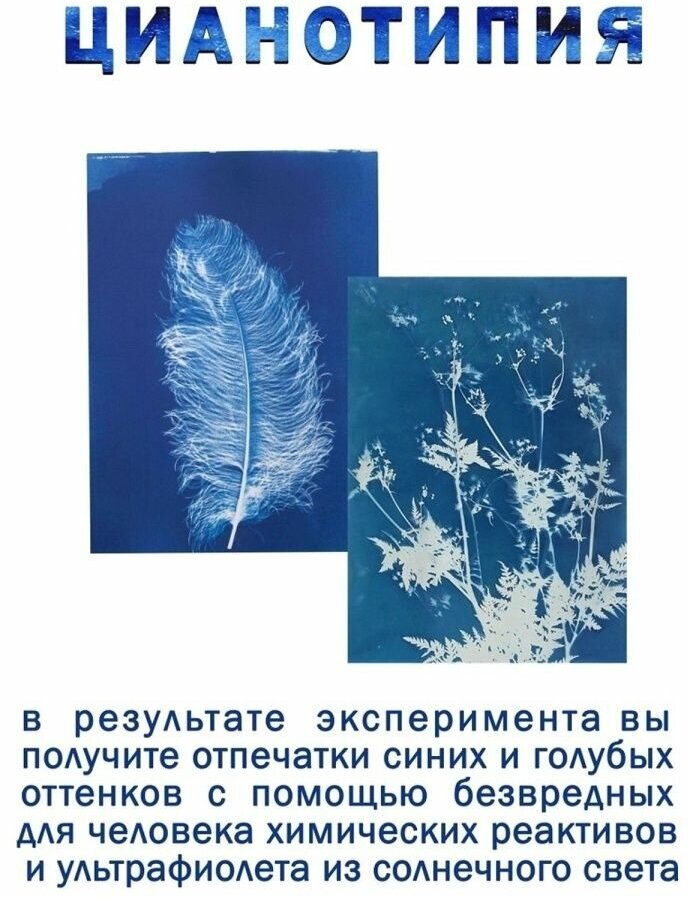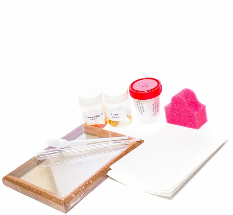 | Комплектация | цитрат аммония, хлорное железо, гексацианоферрат калия, стаканчик мерный, чайная ложка, пипетка Пастера, акварельная бумага, рамка, губка, перчатки инструкция |