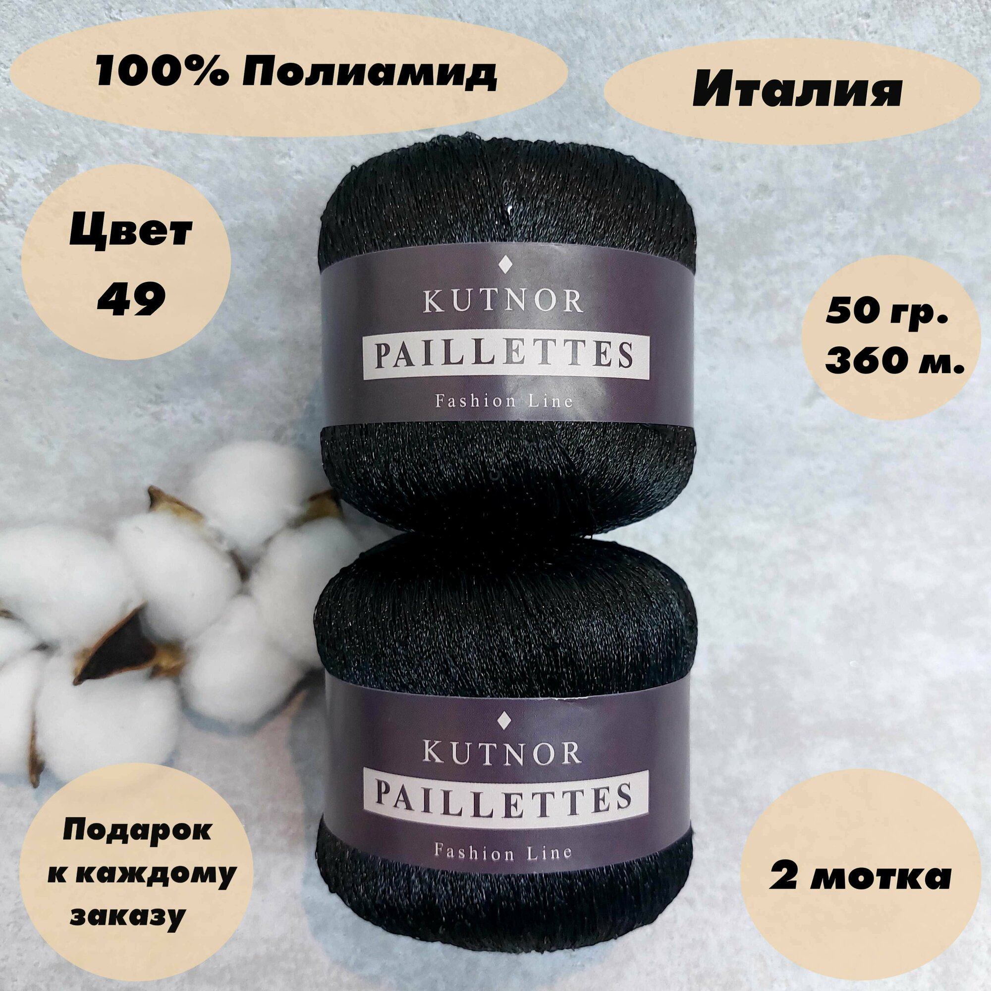Пряжа для вязания Kutnor Paillettes, 2 мотка, Цвет: Черный (Черные пайетки) (49),100% полиамид, 50гр. 360м. интересное: