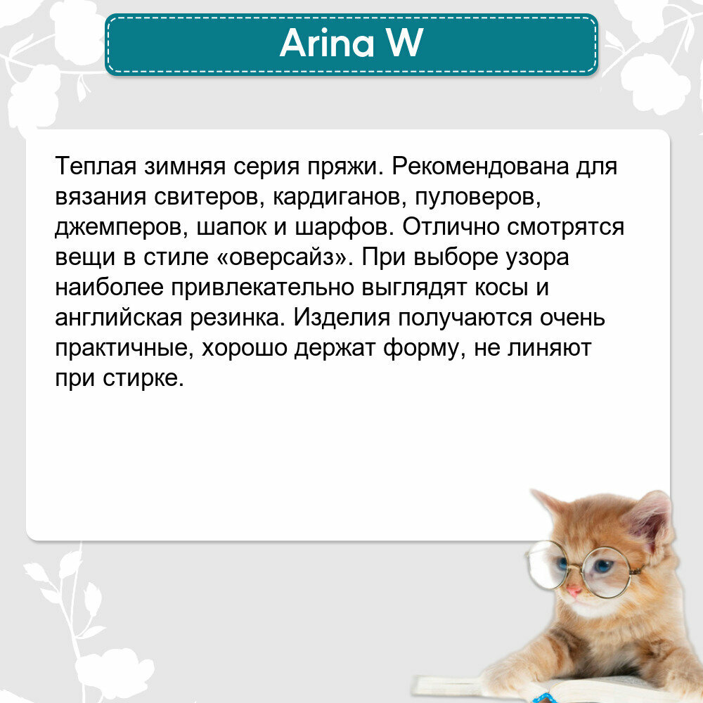 | Плотность вязания для образца 10х10 см | Пряжа для ручного вязания выпускается в мотках и предназначена для вязания спицами и крючком. Зимняя пряжа Arina W на 95% состоит из шерсти. Небольшое добавление акрила делает изделия более прочными, предупреждает деформацию при ВТО. Пряжа мягкой крутки, объемная, хорошо подойдет для теплых вещей оверсайз. Полотно немного колется. Выигрышно смотрятся косы, английская резинка. Перед началом вязания обязательно свяжите образец выбранным узором и постирайте его, расчет производится по высохшему образцу, это убережет вас от лишней работы. |