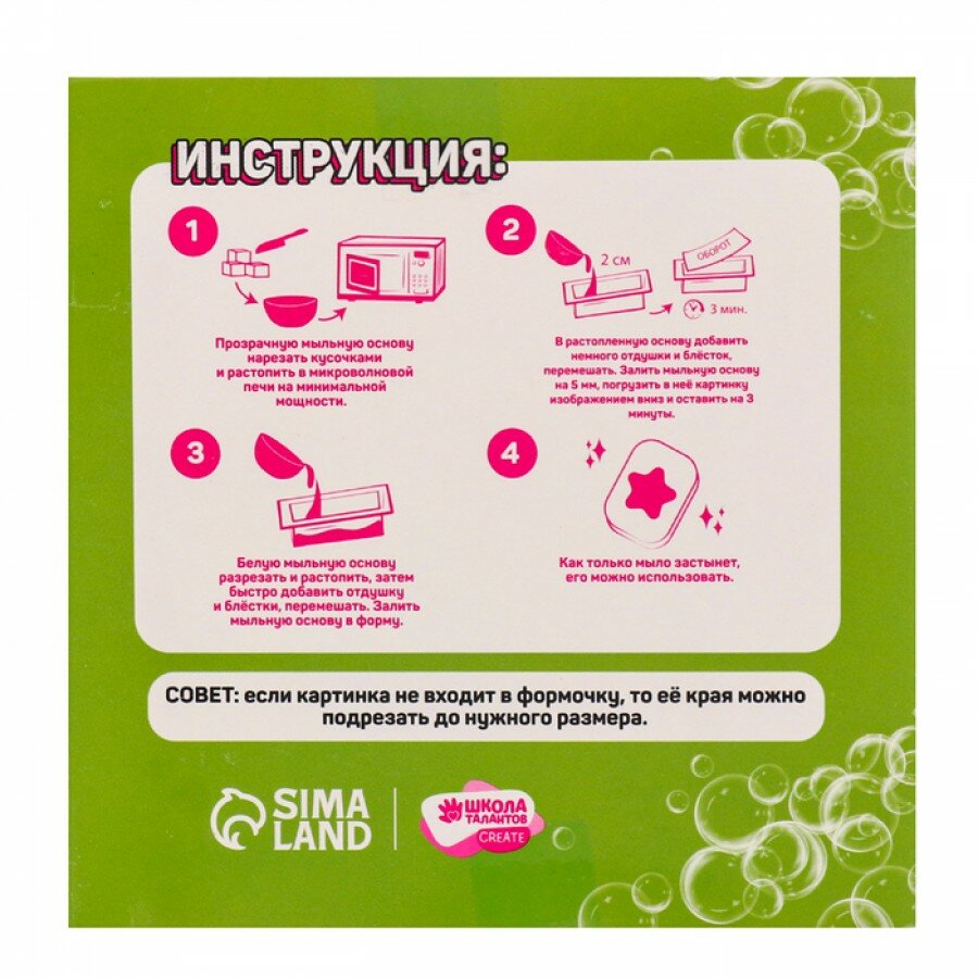 | Комплектация | формочка, мыльная основа, водорастворимая картинка, отдушка, блёстки, инструкция |