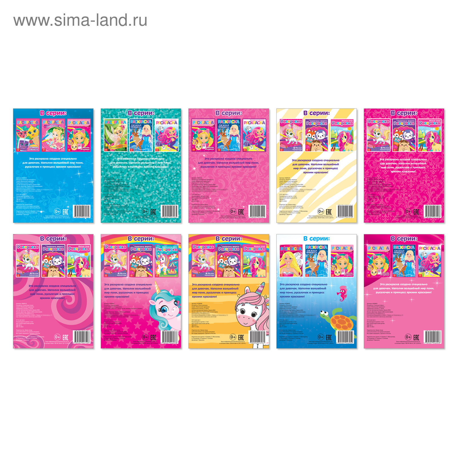 | Комплектация | 10 раскрасок по 12 страниц |