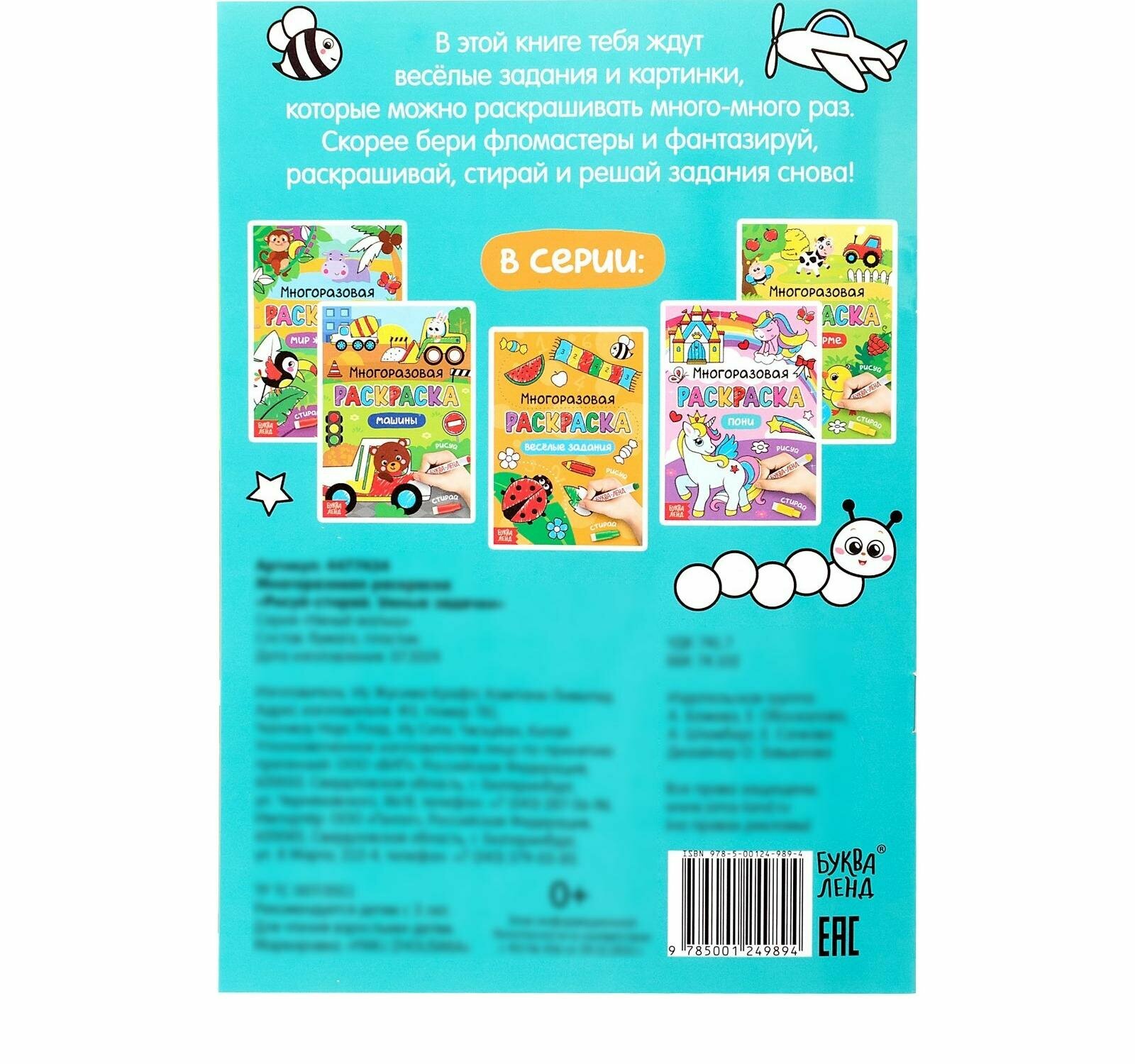Раскраска многоразовая "Рисуй-стирай. Умные задачки" 12 стр, 4 маркера на водной основе, Буква-Ленд