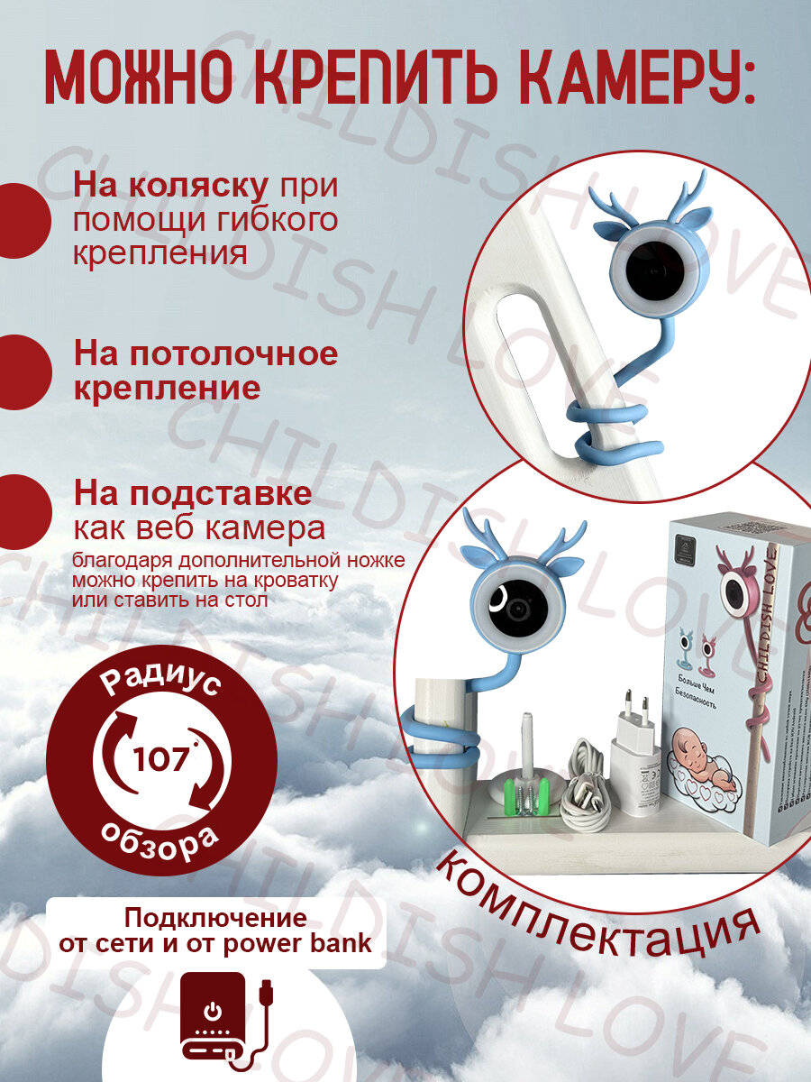 | Особенности | датчик влажности, датчик движения, датчик температуры, двусторонняя голосовая связь, колыбельные мелодии, ночник, работа от сети 220 В, функция ночного видения |