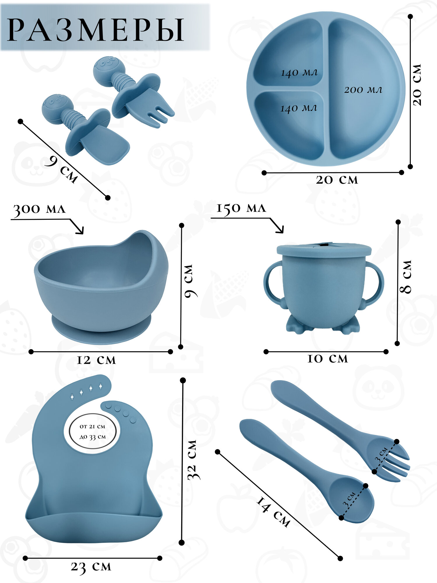 | Комплектация | Нагрудник с кармашком для улавливания пищи. • Умная тарелка на присоске. • Безопасные вилка и ложка. • Тарелка с разделением еды по секциям. • Детские вилка и ложка. • Непроливаемый стакан с 2 разными крышками, трубочкой и нескользящим дном. |