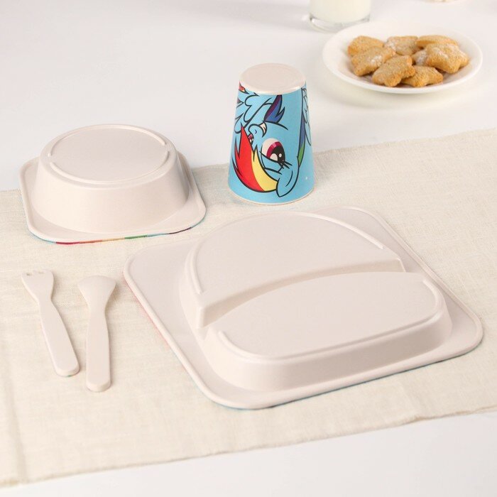 Набор детской бамбуковой посуды, 5 предметов: тарелка, вилка, ложка,стакан,миска "Радуга Дэш", My Little Pony интересное: