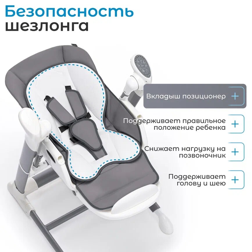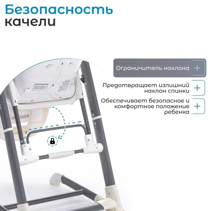 | Дополнительная информация | Максимальная нагрузка: электрокачели до 9 кг, стульчик для кормления (трансформер) до 18 кг, 2 позиции регулировки спинки кресла электрокачелей, работает от 4 батареек типа «D» и от адаптера, 12 мелодий с регулировкой громкости и 2 звука природы, таймер 8, 15 и 30 минут |