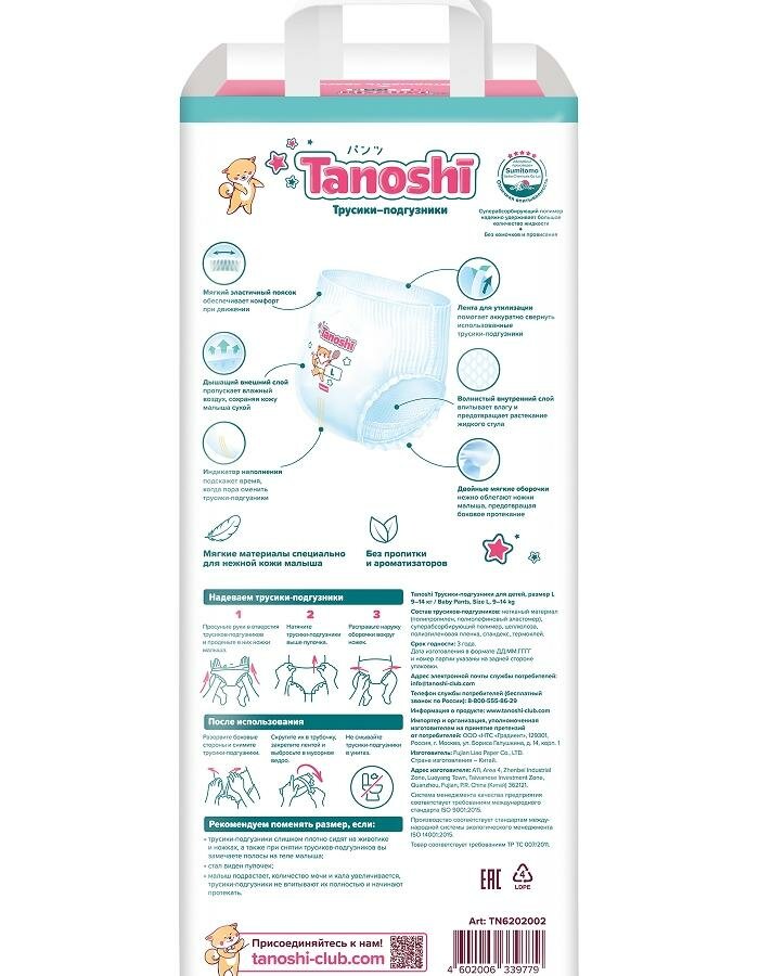 Tanoshi Трусики-подгузники для детей, размер L 9-14 кг, 44 шт. интересное: