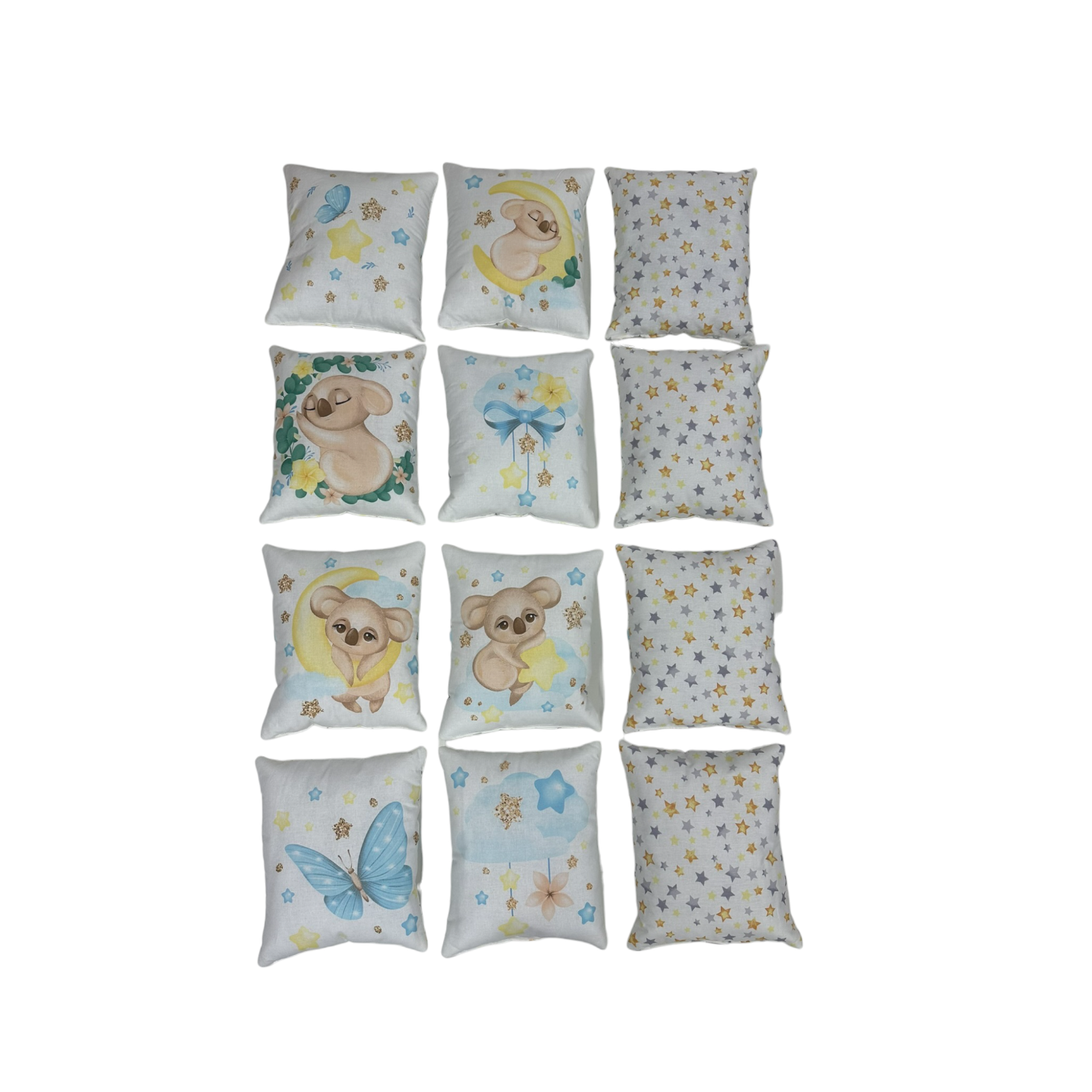 Купить Бортики подушки в кроватку новорожденному 32х27 - 12шт, принт "Коалы мальчики золото"