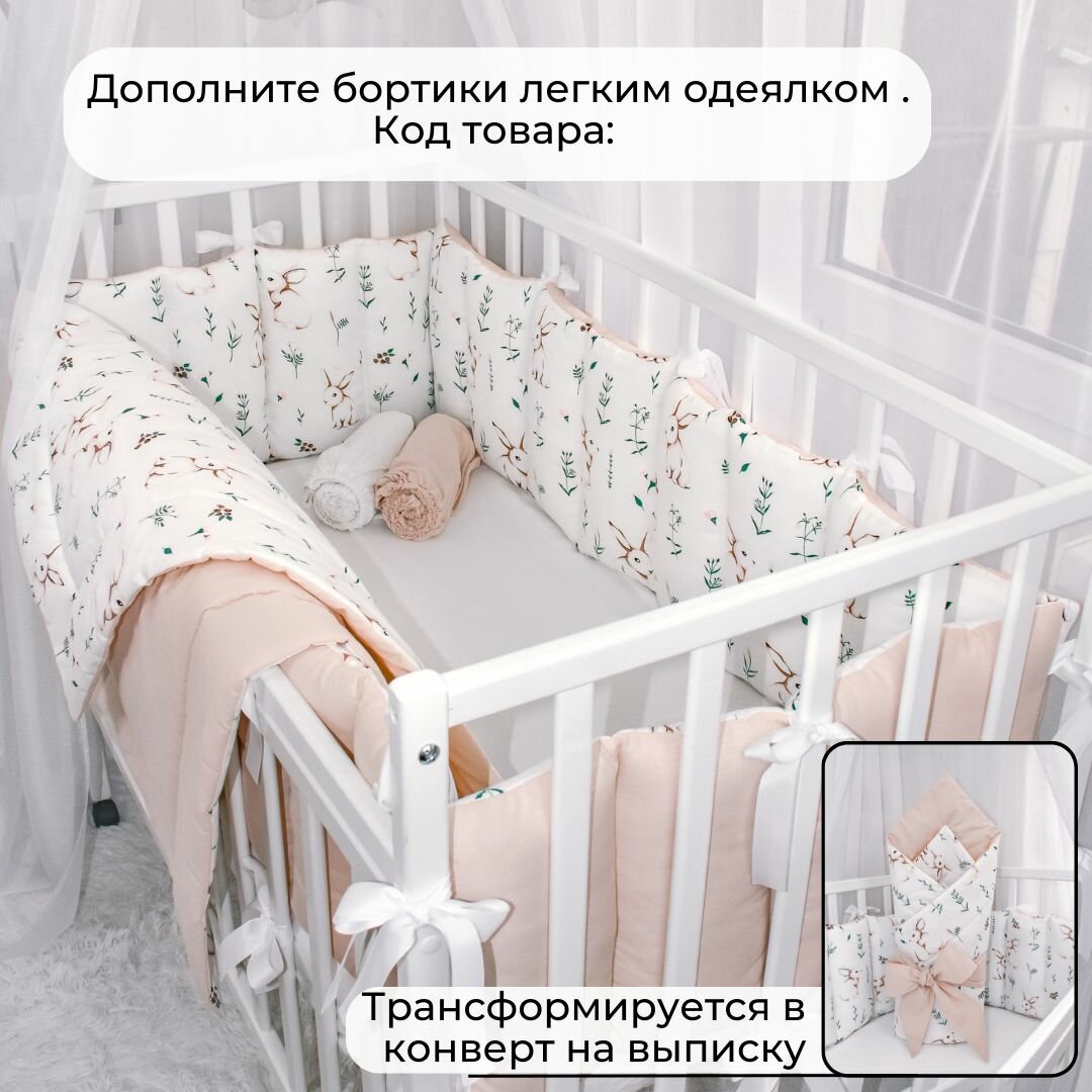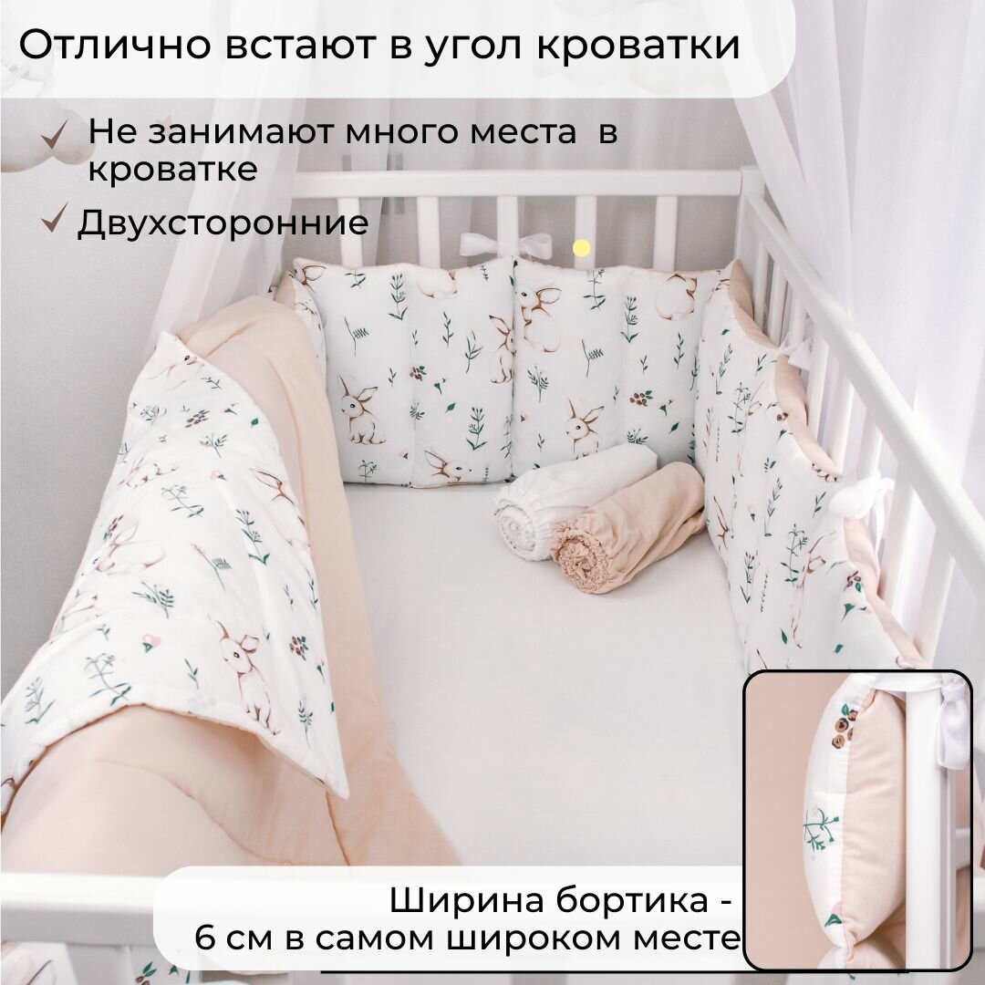 Бортики в кроватку для новорожденного "Зайчики с миндалём": плоские, тонкие, стёганые