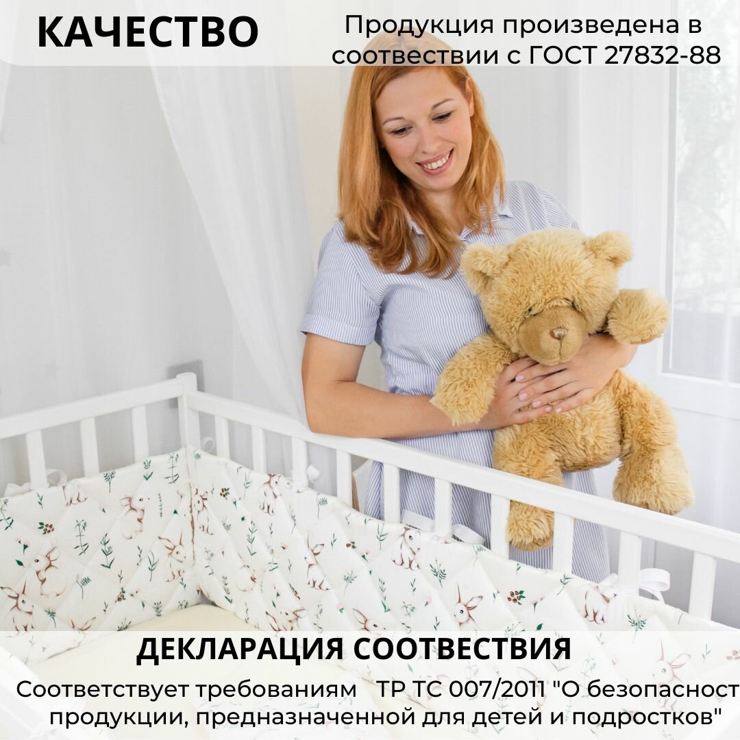 Купить Бортики в кроватку для новорожденного "Зайчики с миндалём": плоские, тонкие, стёганые