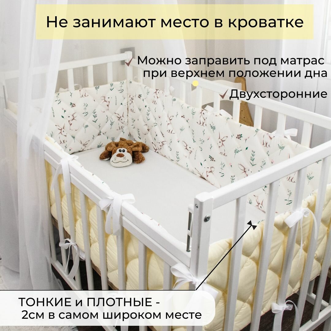 Бортики-заборчики в кроватку для новорожденного "Зайки с молочным": плоские, тонкие, стёганые
