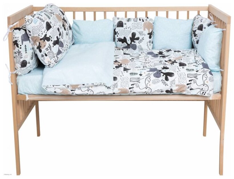 | Комплектация | пододеяльник на молнии 1 шт, наволочка 1 шт, простыня на резинке 1 шт, подушки-бортики на завязках со съемными наволочками 30х30 см 12 шт, валик 60х10 см 2 шт |
