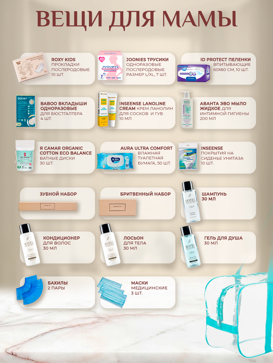 | Состав набора | бахилы, ватные диски, ватные палочки, влажная туалетная бумага, влажные салфетки, крем для сосков, мыло, одноразовые маски, одноразовые покрытия на сиденье унитаза, пеленки для мамы, пеленки для новорожденного, подгузники, прокладки для груди, прокладки послеродовые, трусики |