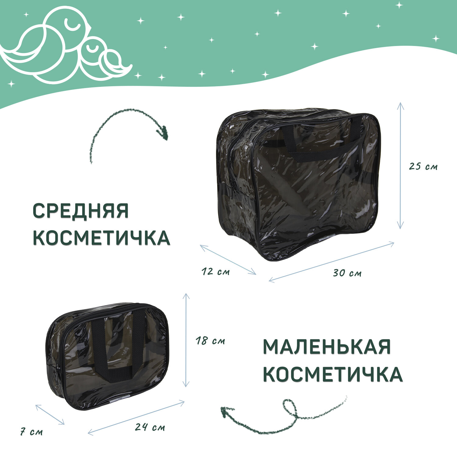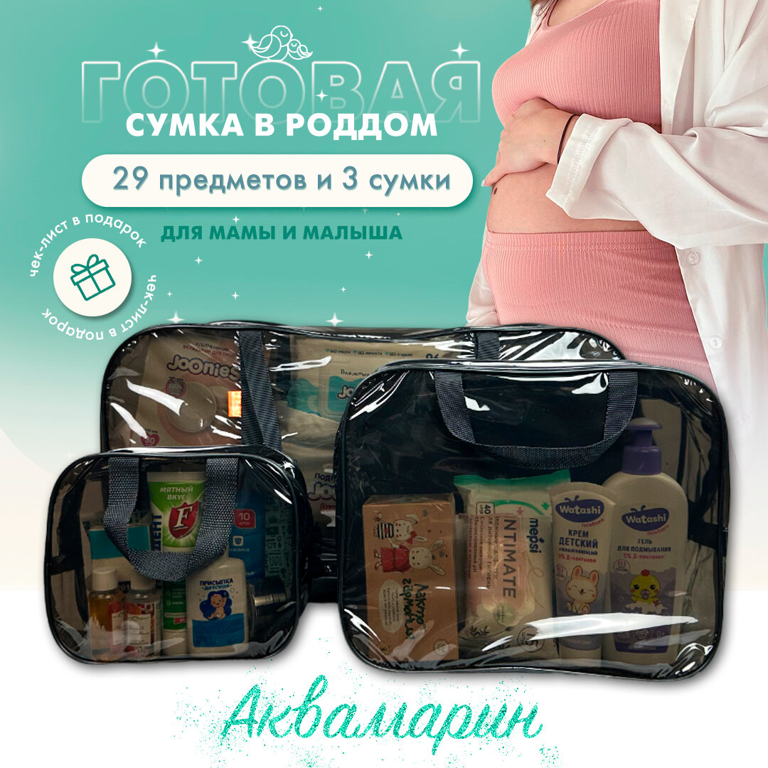 Сумка в роддом готовая для мамы и малыша с наполнением, 29 предметов, 3 сумки, комплектация "Аквамарин", прозрачная