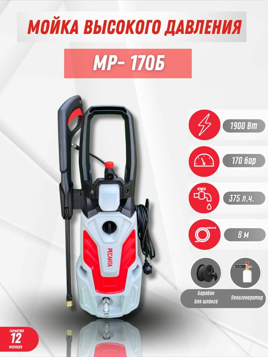 Мойка высокого давления РECАНTА, 1900 Вт, 170 Бар, 375 л/ч, барабан, пеногенератор, функция самовсасывания интересное: