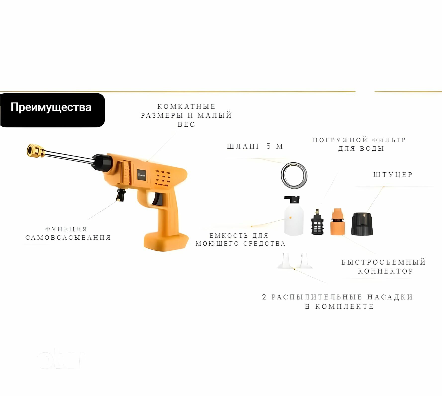 | Подробная комплектация | Пистолет - 1 шт. Емкость для моющего средства - 1 шт. Металлическая штанга - 1 шт. Шланг - 1 шт. Фильтр для шланга - 1 шт. Штуцер для шланга - 1 шт. Коннектор для шланга - 1 шт. Насадка-распылитель - 2 шт. |