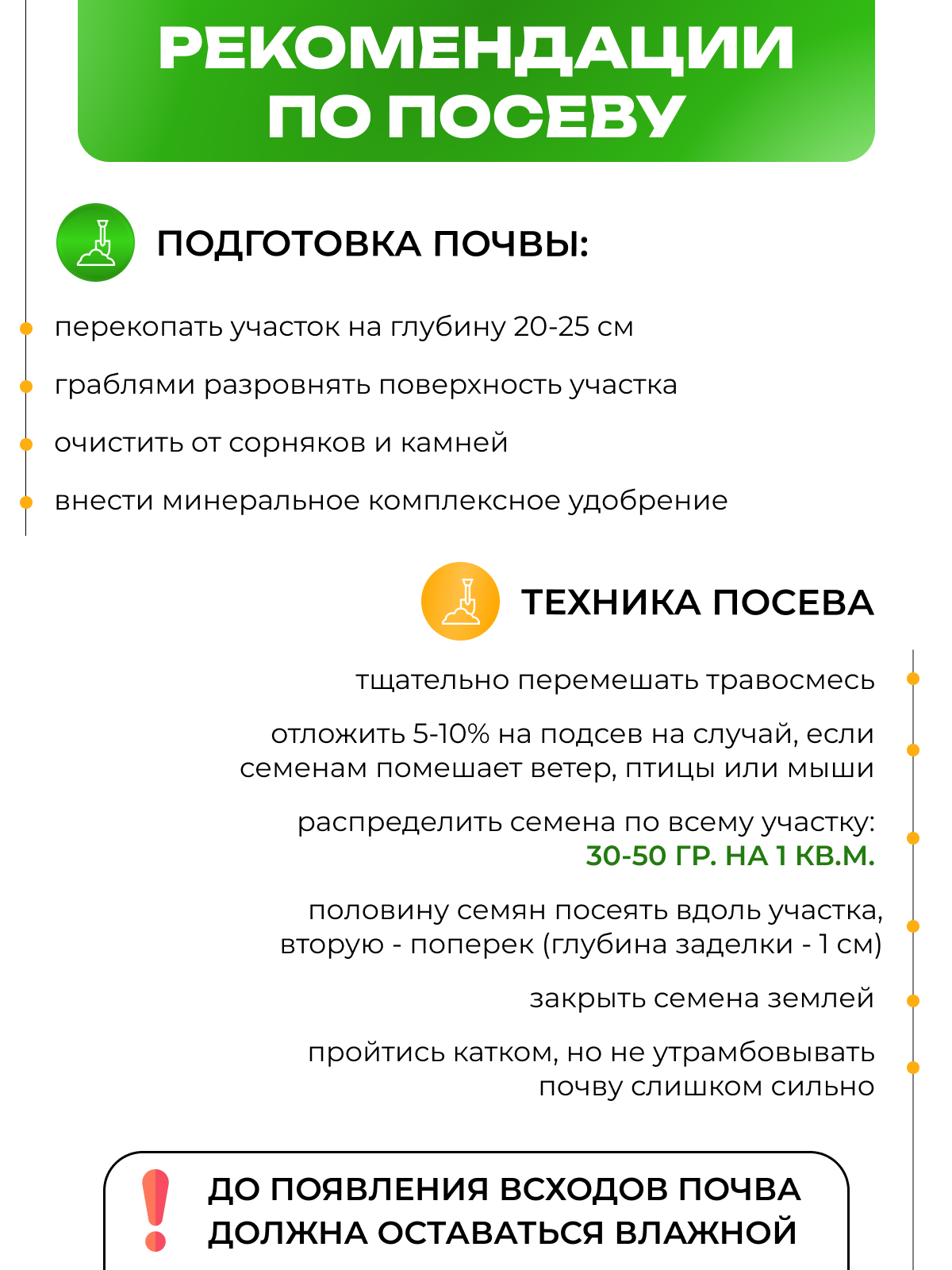 | Дополнительная информация | Самым доступным остается посев вручную. Смесь необходимо тщательно перемешать. Семена должны быть посеяны на глубину не более 1 см. Старайтесь равномерно распределить семена по всему участку таким образом, чтобы Ваш расход составил 30 - 50 грамм на 1 кв. метр. Для уплотнения почвы над семенами, нужно пройтись катком. Ни в коем случае нельзя утрамбовывать почву слишком сильно. До появления всходов почва должна оставаться влажной. |