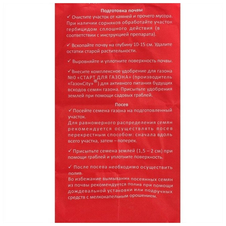 | Дополнительная информация | хранить в сухом прохладном месте, овсяница красная – 15%, райграс однолетний – 35%, мятлик луговой – 5%, овсяница луговая – 15%, райграс пастбищный – 30% |