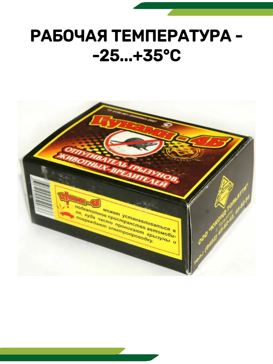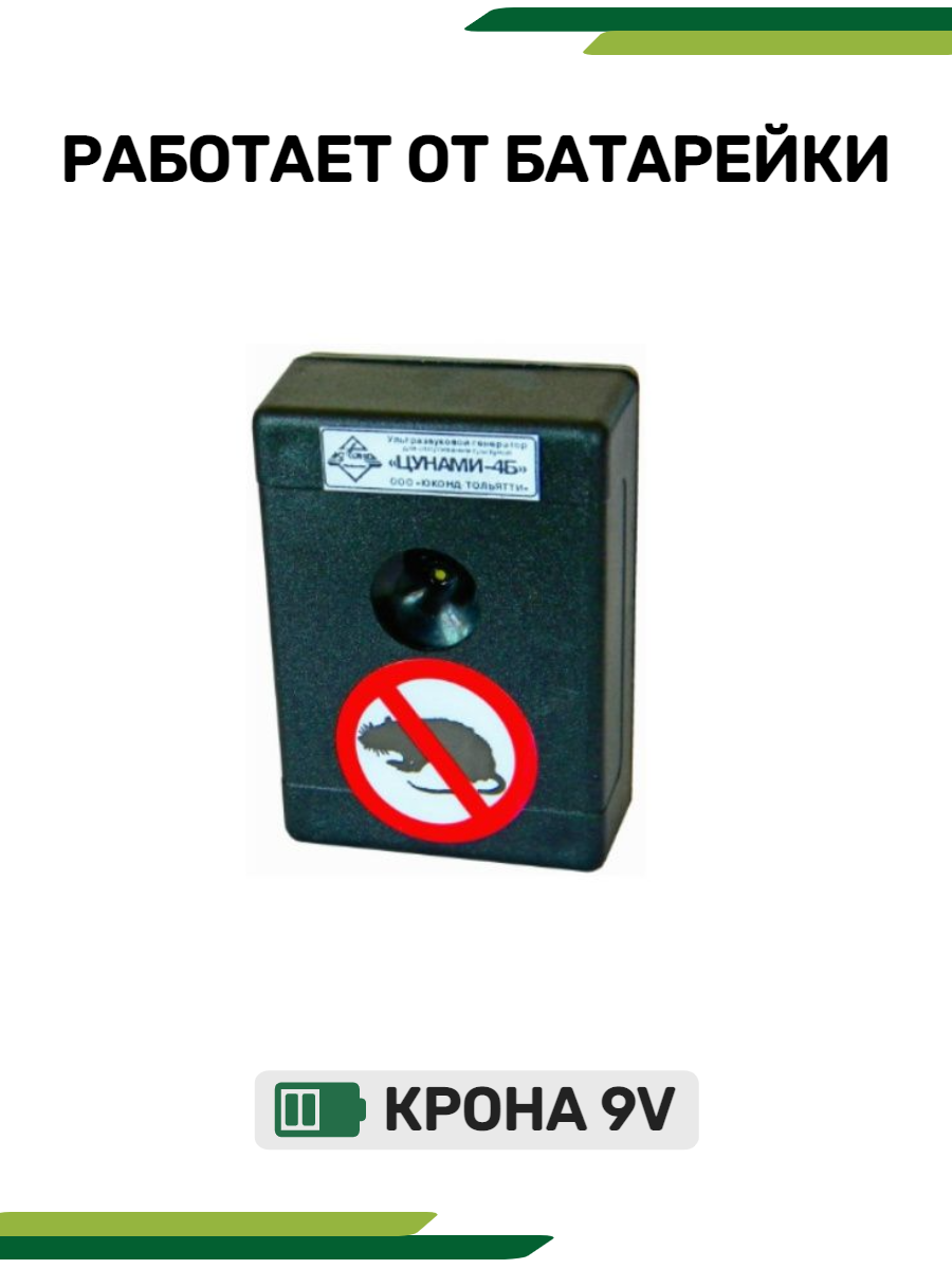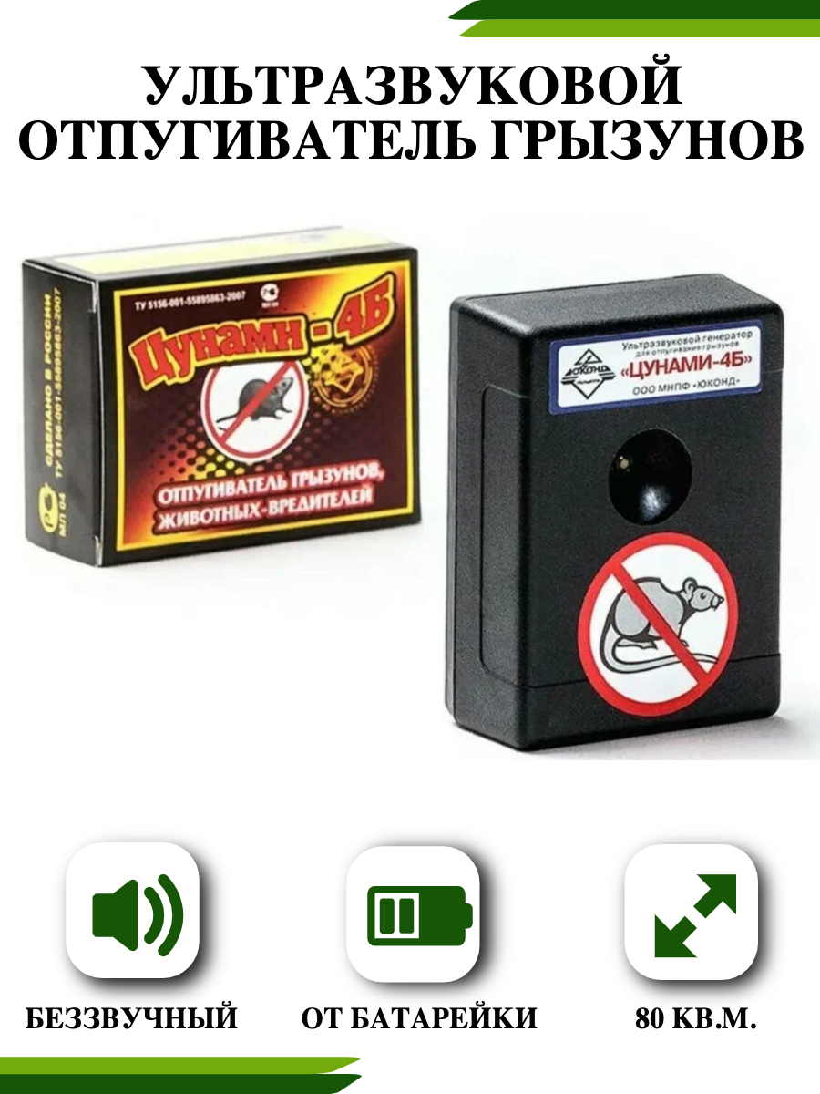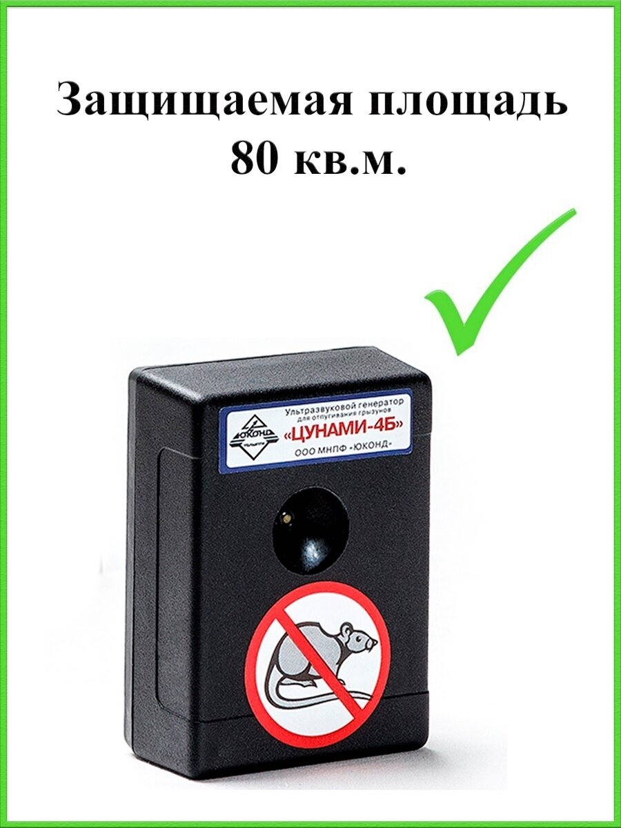 | Дополнительная информация | Средство защиты дома, сада и дачи от грызунов Цунами 4 Б до 80 м2 отпугиватель крыс и мышей и подробная инструкция по эксплуатации. Электронный ультразвуковой прибор, работает от батарейки Крона. В России появилось много неэффективных китайских устройств антигрызуна, которые предлагают купить под маркой Цунами. Будьте внимательнее к таким предложениям купить отпугивающее устройство "по супер низким ценам". Мы работаем напрямую с российским производителем грызунов Цунами - заводом Юконд. |