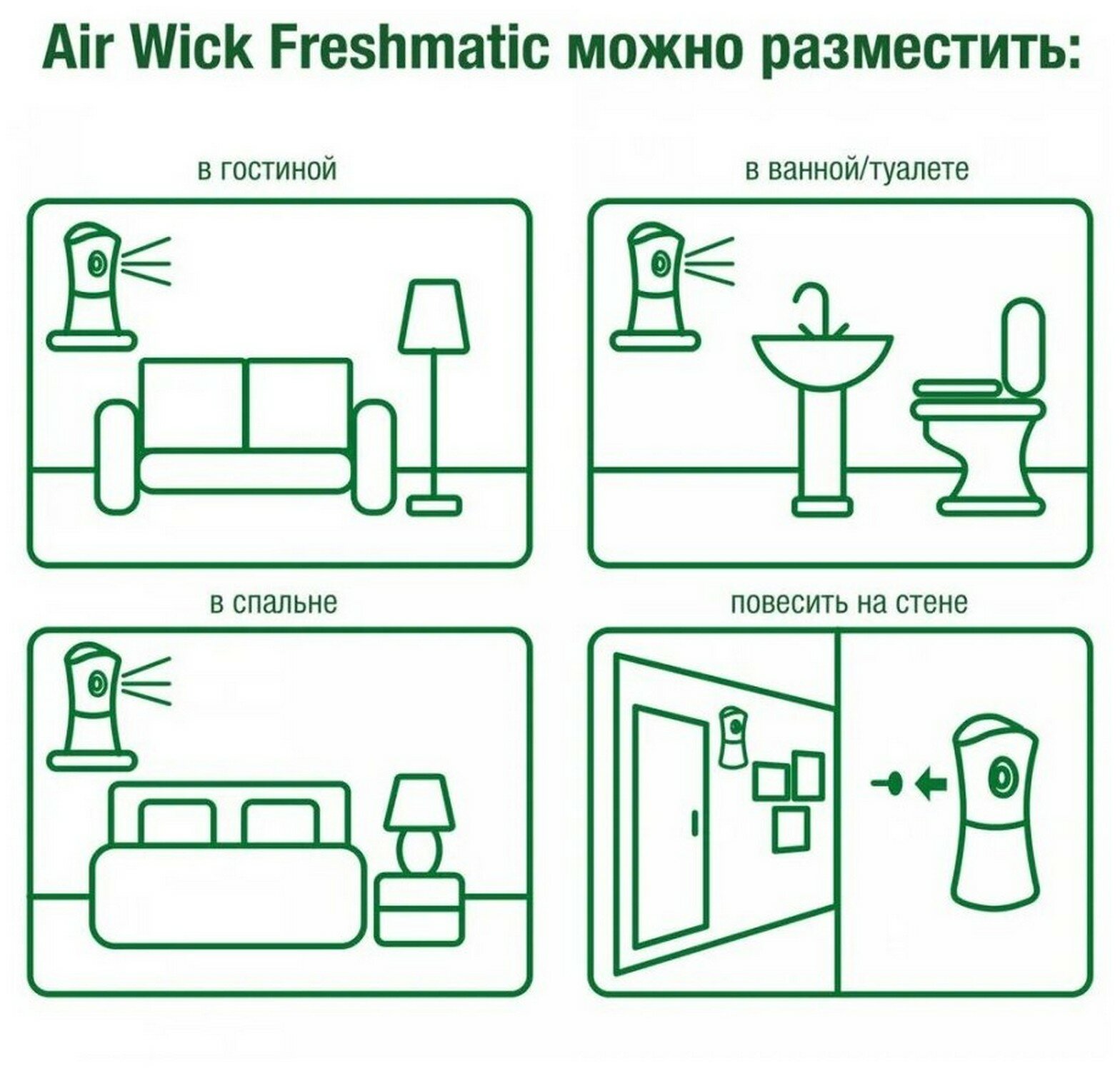| Дополнительная информация | баллон для автоматического освежителя воздуха Air Wick Freshmatic, перед тем, как вставить аэрозоль, проверьте, что диспенсер выключен, не направляйте в лицо при включении или при установке интервала распыления, после включения распыление начнется автоматически через 15 сек |