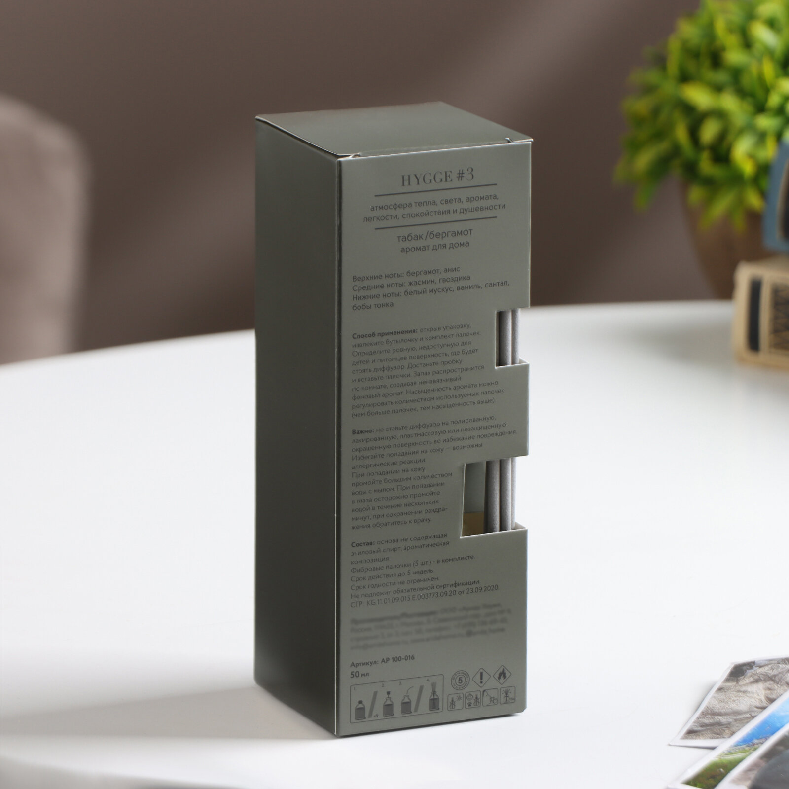 | Дополнительная информация | Способ применения Откройте упаковку, извлеките бутылочку и комплект палочек. Определите ровную, недоступную для детей и питомцев поверхность, где будет стоять диффузор. Достаньте пробку и вставьте палочки. Запах распространиться по комнате, создавая ненавязчивый фоновый аромат. Насыщенность аромата можно регулировать количеством используемых палочек - чем больше палочек, тем насыщенность выше. Важно: не ставьте диффузор на полированную, лакированную, пластмассовую или незащищенную окрашенную поверхность во избежание повреждения. Избегайте попадания на кожу - возможны аллергические реакции. При попадании на кожу промойте большим количеством воды с мылом. При попадании в глаза осторожно промойте водой в течении нескольких минут, при сохранении раздражения обратитесь к врачу. |
