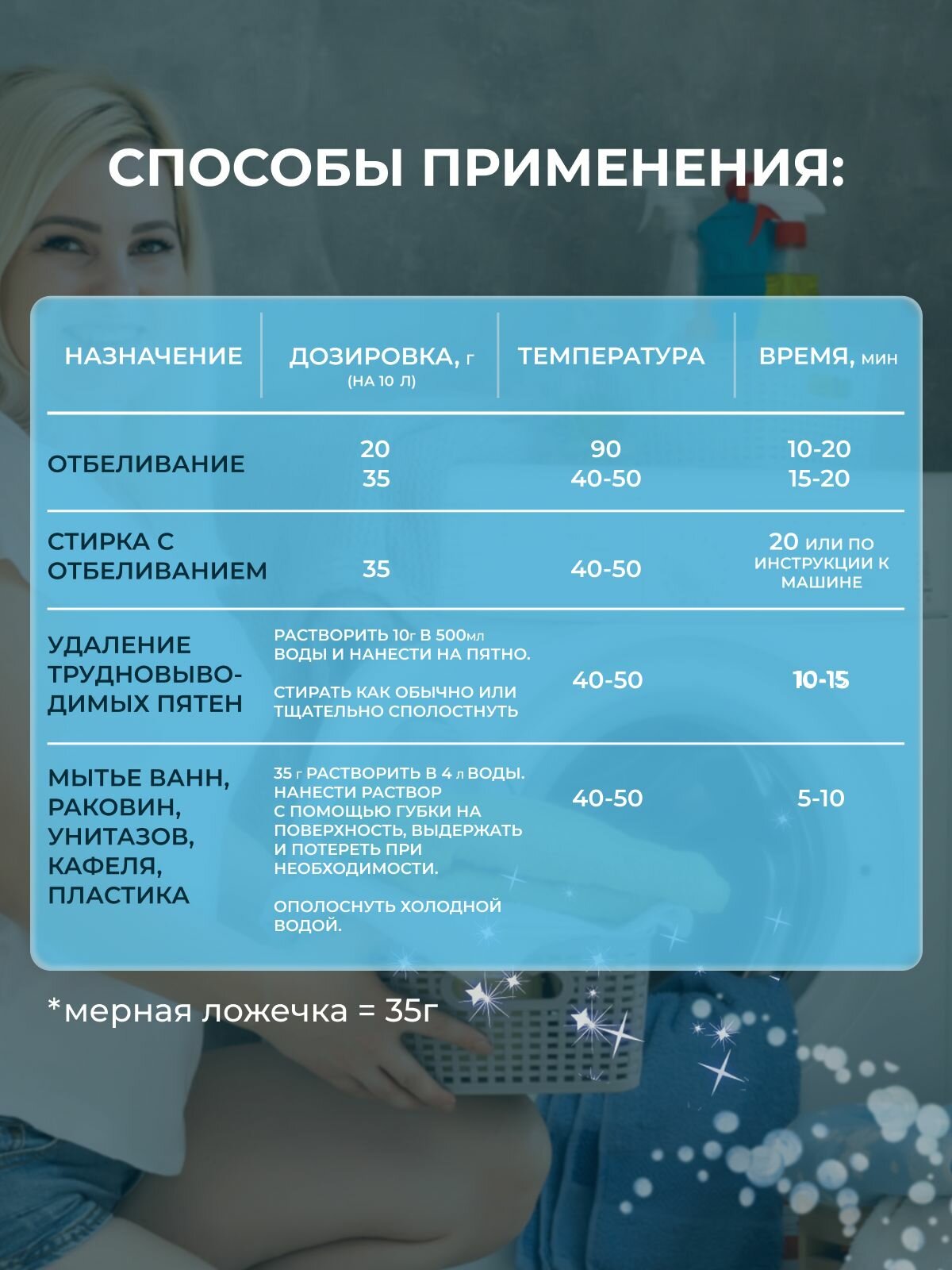 | Способ применения | 35 г (1 мерная ложечка) отбеливателя на 2 кг сухого белья. |