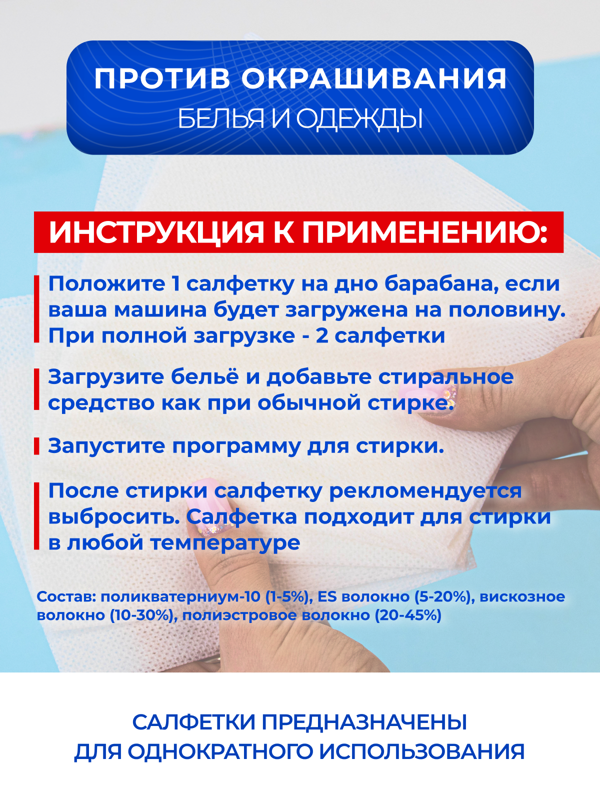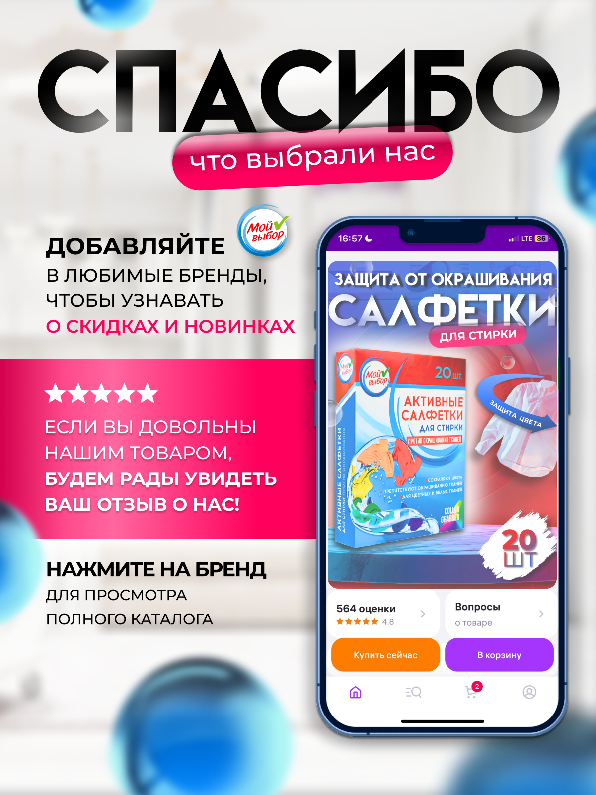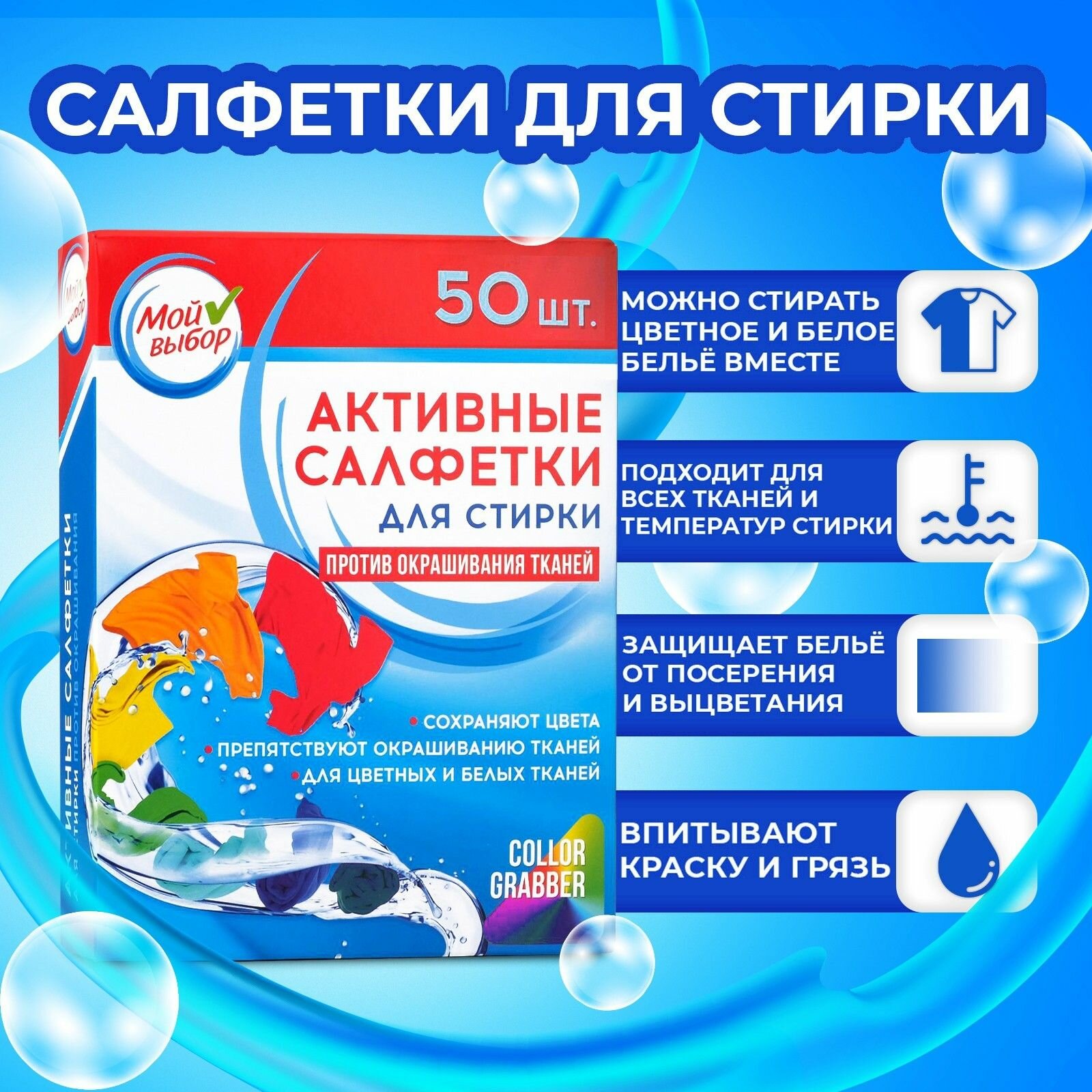 Активные салфетки для стирки "Мой выбор" против окрашивания тканей, для разноцветных тканей, одноразовые, 50 шт