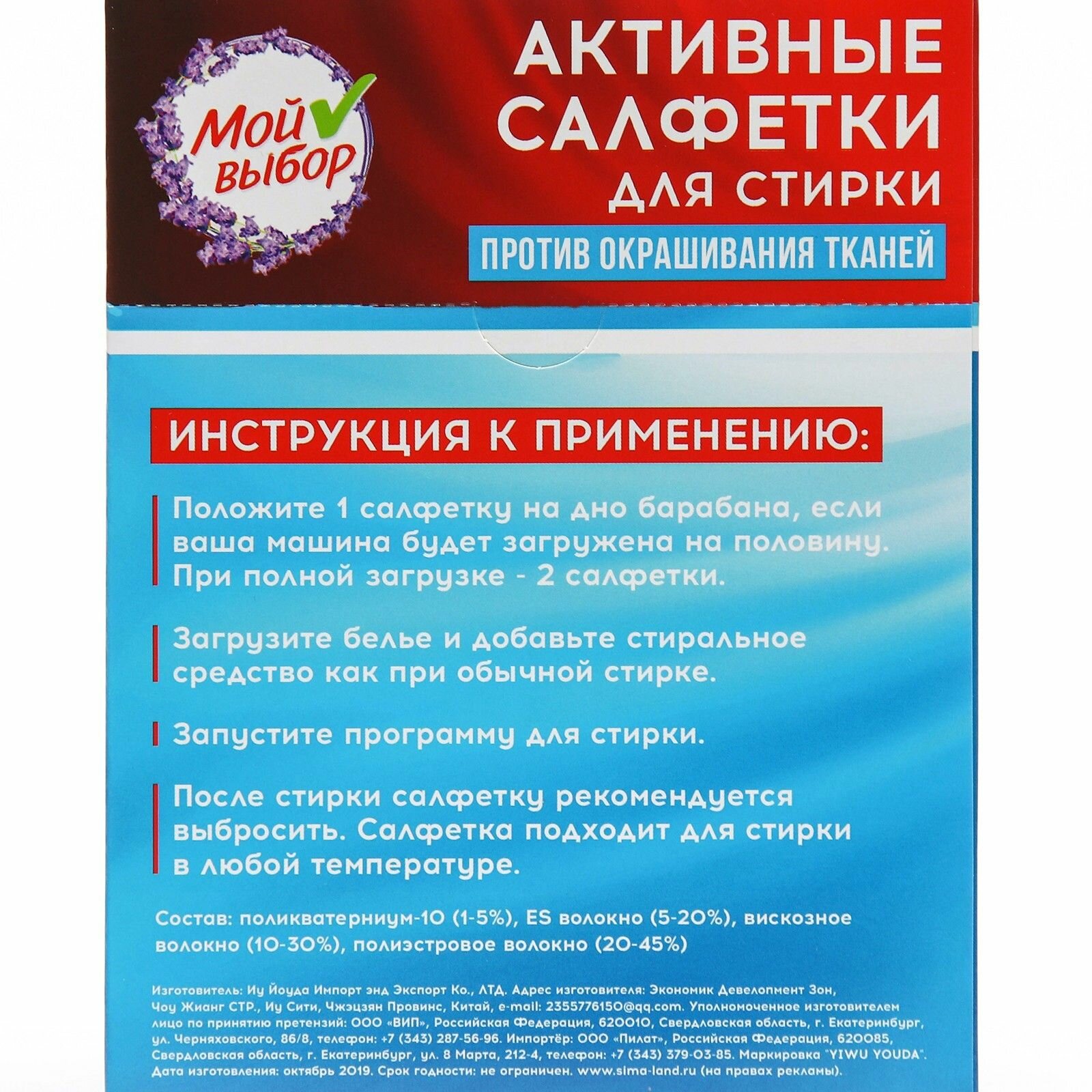 Активные салфетки для стирки "Мой выбор" против окрашивания тканей, для разноцветных тканей, одноразовые, 50 шт
