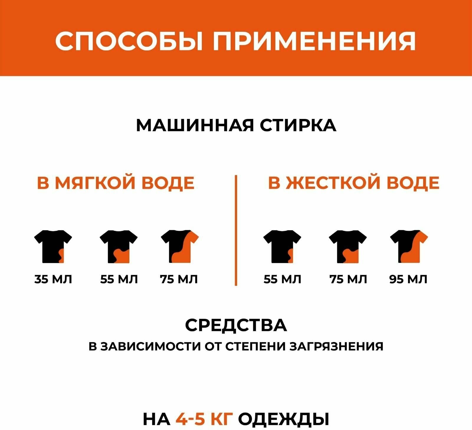 | Способ применения | Способ применения: При выборе режима стирки следуйте рекомендациям, указанным на ярлыках вашей одежды. При стирке деликатных изделий в машинах-автомат загружайте барабан не более чем на ½. Перед использованием рекомендуется взбалтывать. Рекомендуемая температура стирки от +30 °C до +60 °C Машинная стирка в мягкой воде: При слабом загрязнении: 35 мл средства на 4-5 кг одежды. При среднем загрязнении: 55 мл средства на 4-5 кг одежды. При сильном загрязнении: 75 мл средства на 4-5 кг одежды. Машинная стирка в жесткой воде: При слабом загрязнении: 55 мл средства на 4-5 кг одежды. При среднем загрязнении: 75 мл средства на 4-5 кг одежды. При сильном загрязнении: 95 мл средства на 4-5 кг одежды. Ручная стирка в мягкой воде: развести 35 мл средства в 10 л воды. Ручная стирка в жесткой воде: развести 55 мл средства в 10 л воды. |